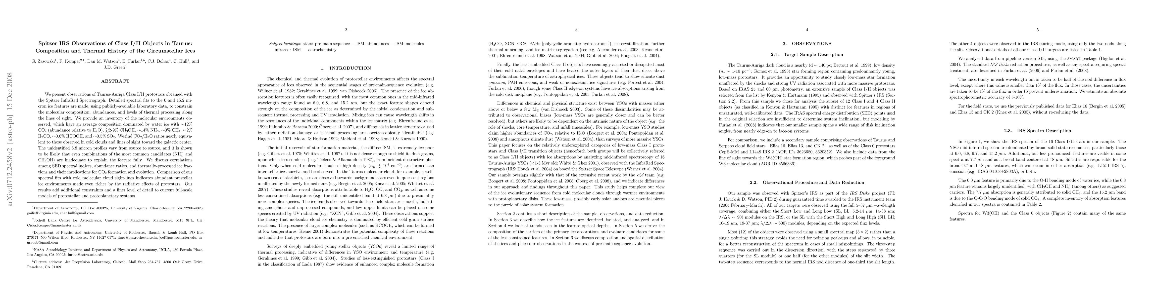 We present observations of Taurus-Auriga Class I/II protostars obtained with the Spitzer InfraRed Spectrograph. Detailed spectral fits to the 6 and 15 micron features are made, using publicly-available laboratory data, to constrain the molecular composition, abundances, and levels of thermal processing along the lines of sight. We provide an inventory of the molecular environments observed, which have an average composition dominated by water ice with ~12% CO_2 (abundance relative to H_2O), >~2-9% CH_3OH, <~14% NH_3, ~4% CH_4, ~2% H_2CO, ~0.6% HCOOH, and ~0.5% SO_2. We find CO_2/H_2O ratios nearly equivalent to those observed in cold clouds and lines of sight toward the galactic center. The unidentified 6.8 micron profiles vary from source to source, and it is shown to be likely that even combinations of the most common candidates (NH_4+ and CH_3OH) are inadequate to explain the feature fully. We discuss correlations among SED spectral indices, abundance ratios, and thermally-processed ice fractions and their implications for CO_2 formation and evolution. Comparison of our spectral fits with cold molecular cloud sight-lines indicates abundant prestellar ice environments made even richer by the radiative effects of protostars. Our results add additional constraints and a finer level of detail to current full-scale models of protostellar and protoplanetary systems.