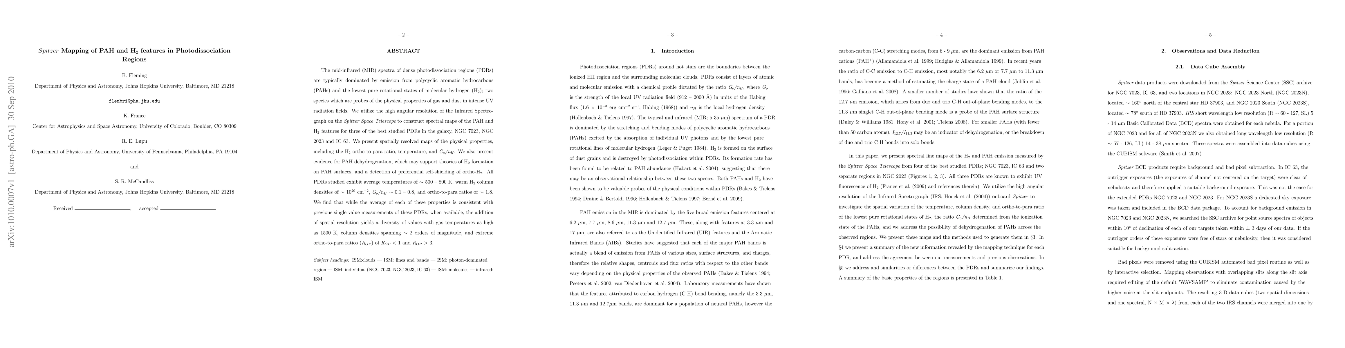 This study uses Spitzer Space Telescope's Infrared Spectrograph to map PAH and H2 features in three PDRs, revealing spatially resolved physical properties and supporting theories of H2 formation on PAH surfaces. The research finds significant variability in gas temperatures, column densities, and ortho-to-para ratios across the regions.