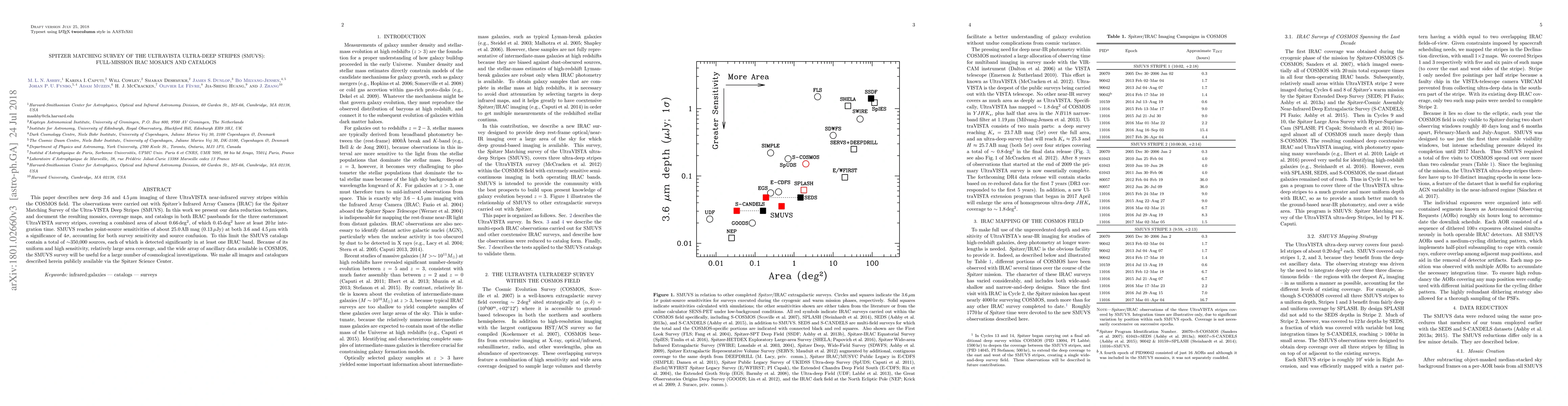 This paper presents new deep 3.6 and 4.5 micron Spitzer IRAC imaging of three UltraVISTA survey stripes in the COSMOS field, detailing data reduction techniques and resulting mosaics, coverage maps, and catalogs. The SMUVS survey achieves a sensitivity of 25.0 AB mag and will support numerous cosmological studies due to its uniform coverage and extensive ancillary data.
