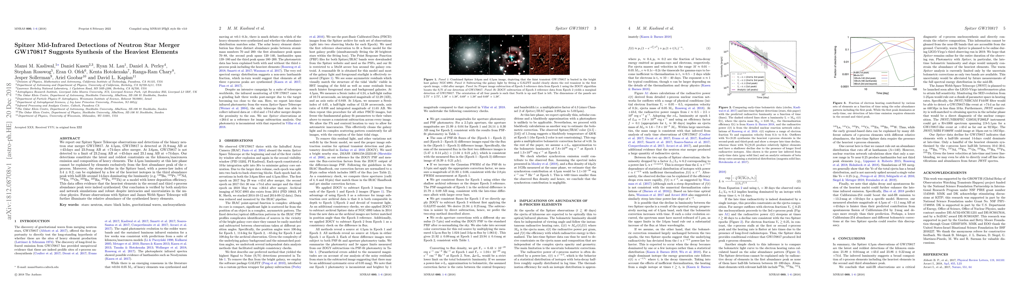 Spitzer Space Telescope detected the neutron star merger GW170817 in mid-infrared at 4.5um, providing evidence for the synthesis of the heaviest elements in the third r-process abundance peak. The observed steep decline suggests dominance of long-lived isotopes, indicating the production of heavy elements beyond the first abundance peak.