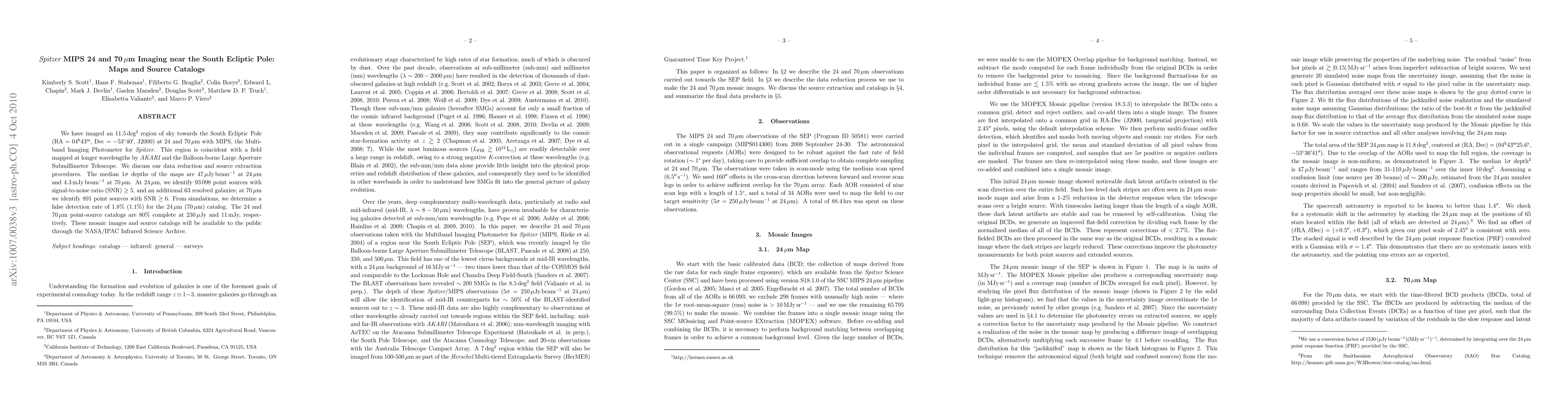 This study presents MIPS 24 and 70 micron imaging of an 11.5 sq. deg. region near the South Ecliptic Pole, identifying 93,098 and 891 point sources respectively, with detailed data reduction and source extraction procedures. The catalogs will be publicly available, aiding in astronomical research.