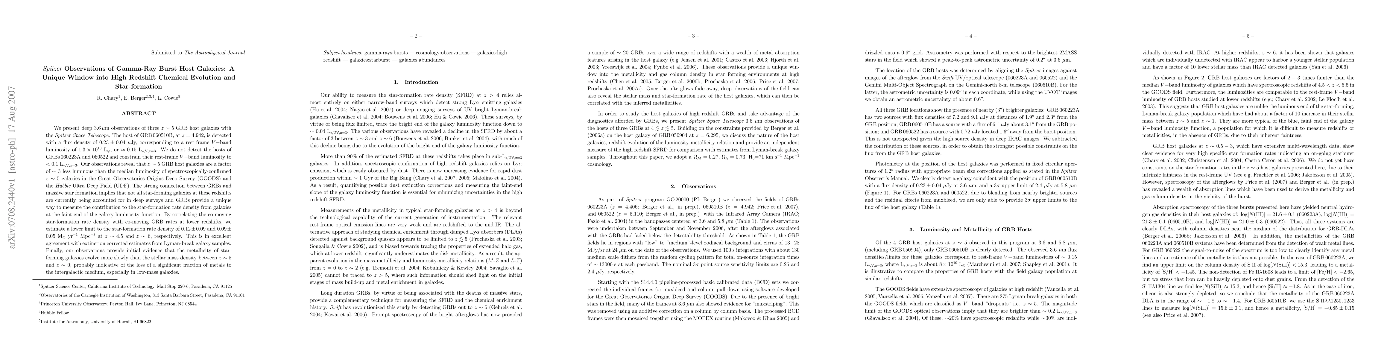 We present deep Spitzer 3.6 micron observations of three z~5 GRB host galaxies. Our observations reveal that z~5 GRB hosts are a factor of 3 less luminous than the median rest-frame V-band luminosity of spectroscopically confirmed z~5 galaxies in the GOODS fields and the UDF. The strong connection between GRBs and massive star formation implies that not all star-forming galaxies at these redshifts are currently being accounted for in deep surveys and GRBs provide a unique way to measure the contribution to the star-formation rate density from galaxies at the faint end of the galaxy luminosity function. By correlating the co-moving star-formation rate density with co-moving GRB rates at lower redshifts, we estimate a lower limit to the star-formation rate density of 0.12+/-0.09 and 0.09+/-0.05 M_sun/yr/Mpc^3 at z~4.5 and z~6, respectively. Finally, we provide evidence that the average metallicity of star-forming galaxies evolves as (stellar mass density)^(0.69+/-0.17) between $z\sim5$ and $z\sim0$, probably indicative of the loss of a significant fraction of metals to the intergalactic medium, particularly in low-mass galaxies.