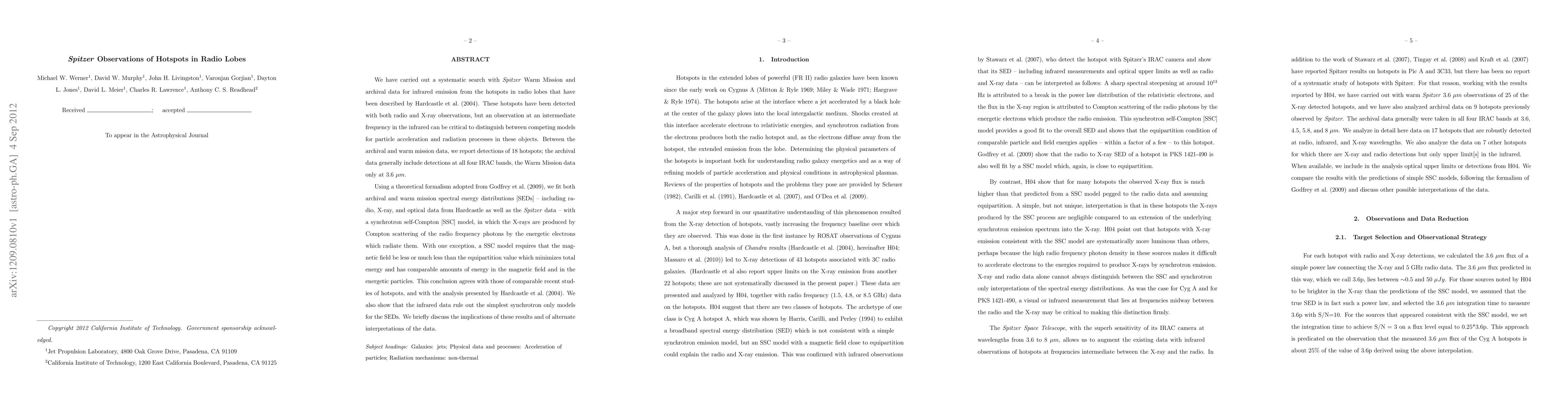 We have carried out a systematic search with Spitzer Warm Mission and archival data for infrared emission from the hotspots in radio lobes that have been described by Hardcastle et al. (2004). These hotspots have been detected with both radio and X-ray observations, but an observation at an intermediate frequency in the infrared can be critical to distinguish between competing models for particle acceleration and radiation processes in these objects. Between the archival and warm mission data, we report detections of 18 hotspots; the archival data generally include detections at all four IRAC bands, the Warm Mission data only at 3.6 microns. Using a theoretical formalism adopted from Godfrey et al. (2009), we fit both archival and warm mission spectral energy distributions [SEDs] - including radio, X-ray, and optical data from Hardcastle as well as the Spitzer data - with a synchrotron self-Compton [SSC] model, in which the X-rays are produced by Compton scattering of the radio frequency photons by the energetic electrons which radiate them. With one exception, a SSC model requires that the magnetic field be less or much less than the equipartition value which minimizes total energy and has comparable amounts of energy in the magnetic field and in the energetic particles. This conclusion agrees with those of comparable recent studies of hotspots, and with the analysis presented by Hardcastle et al. (2004). We also show that the infrared data rule out the simplest synchrotron only models for the SEDs. We briefly discuss the implications of these results and of alternate interpretations of the data.