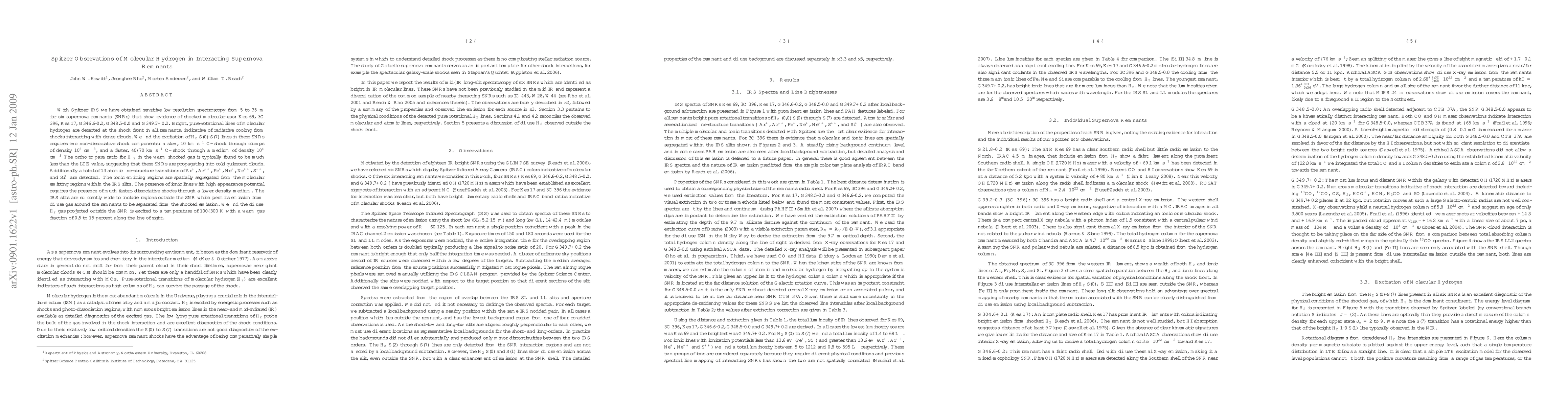 This paper uses Spitzer IRS to detect molecular hydrogen in six supernova remnants, revealing radiative cooling from shocks interacting with dense clouds. The study identifies two shock components and finds that the ortho-to-para ratio of H2 is lower than expected, suggesting interaction with cold, quiescent clouds.