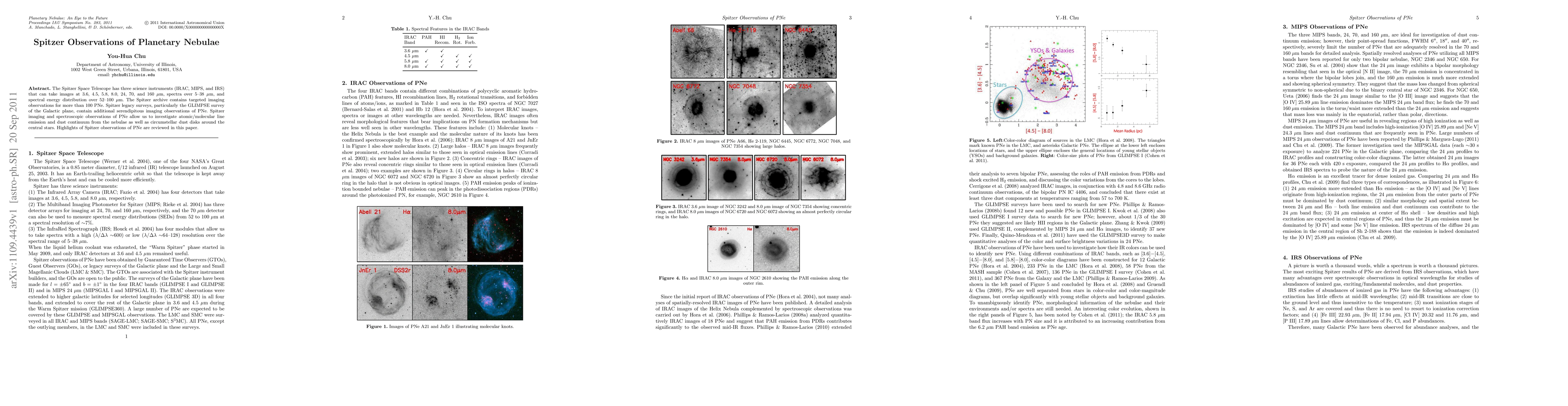 This paper reviews Spitzer Space Telescope observations of planetary nebulae (PNe), utilizing its imaging, spectral, and energy distribution capabilities to study atomic/molecular emissions, dust continuum, and circumstellar dust disks. Key findings from targeted and serendipitous observations are highlighted.