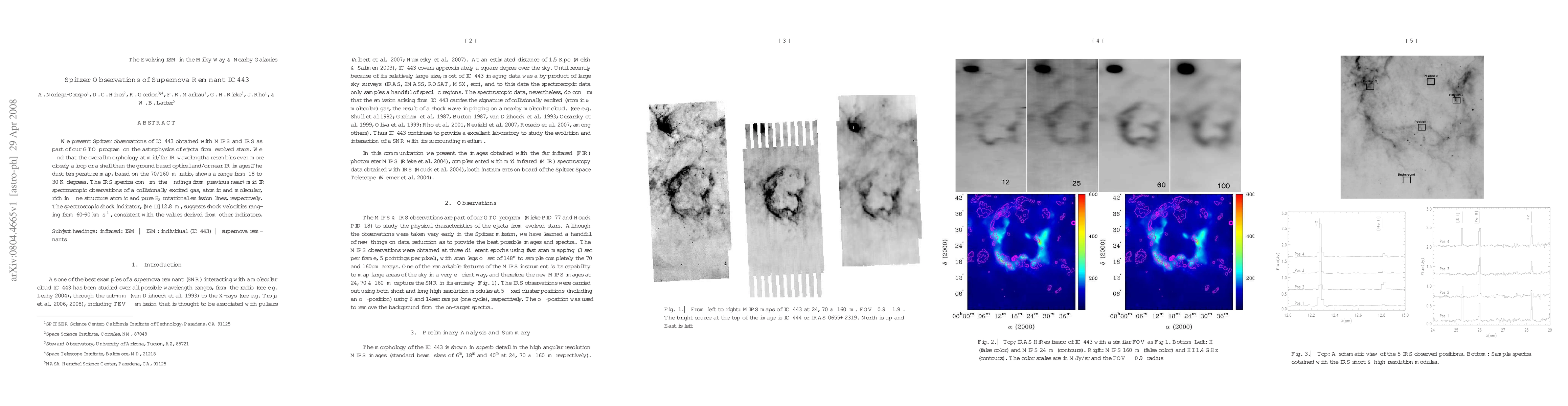 We present Spitzer observations of IC 443 obtained with MIPS and IRS as part of our GTO program on the astrophysics of ejecta from evolved stars. We find that the overall morphology at mid/far IR wavelengths resembles even more closely a loop or a shell than the ground based optical and/or near IR images.The dust temperature map, based on the 70/160micron ratio, shows a range from 18 to 30 K degrees. The IRS spectra confirm the findings from previous near+mid IR spectroscopic observations of a collisionally excited gas, atomic and molecular, rich in fine structure atomic and pure H2 rotational emission lines, respectively. The spectroscopic shock indicator, [Ne II] 12.8micron, suggests shock velocities ranging from 60-90 km/s, consistent with the values derived from other indicators.