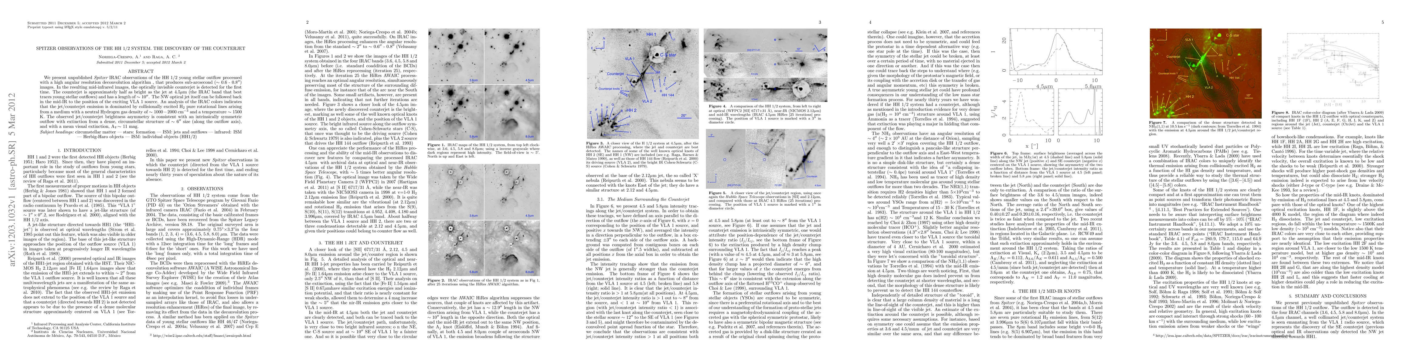 We present unpublished Spitzer IRAC observations of the HH 1/2 young stellar outflow processed with a high angular resolution deconvolution algorithm that produces sub-arcsecond (approx. 0.6" - 0.8") images. In the resulting mid-infrared images the optically invisible counterjet is detected for the first time. The counterjet is approximately half as bright as the jet at 4.5 micron (the IRAC band that best traces young stellar outflows) and has a length of approx. 10". The NW optical jet itself can be followed back in the mid-IR to the position of the exciting VLA 1 source. An analysis of the IRAC colors indicates that the jet/counterjet emission is dominated by collisionally excited H2 pure rotational lines arising from a medium with a neutral Hydrogen gas density of 1000-2000 per cubic cm and a temperature of 1500 K. The observed jet/counterjet brightness asymmetry is consistent with an intrinsically symmetric outflow with extinction from a dense, circumstellar structure of 6" size (along the outflow axis), and with a mean visual extinction of Av=11 mag.