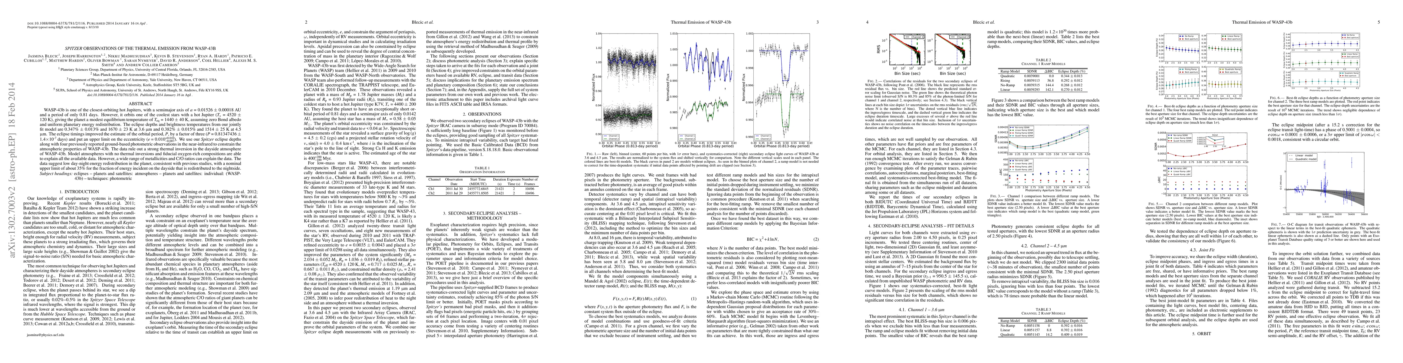 Spitzer observations of WASP-43b reveal its thermal emission and eclipse depths, improving the orbital period and ruling out strong thermal inversions in its atmosphere. The data suggest low day-night energy redistribution and a range of plausible atmospheric compositions.