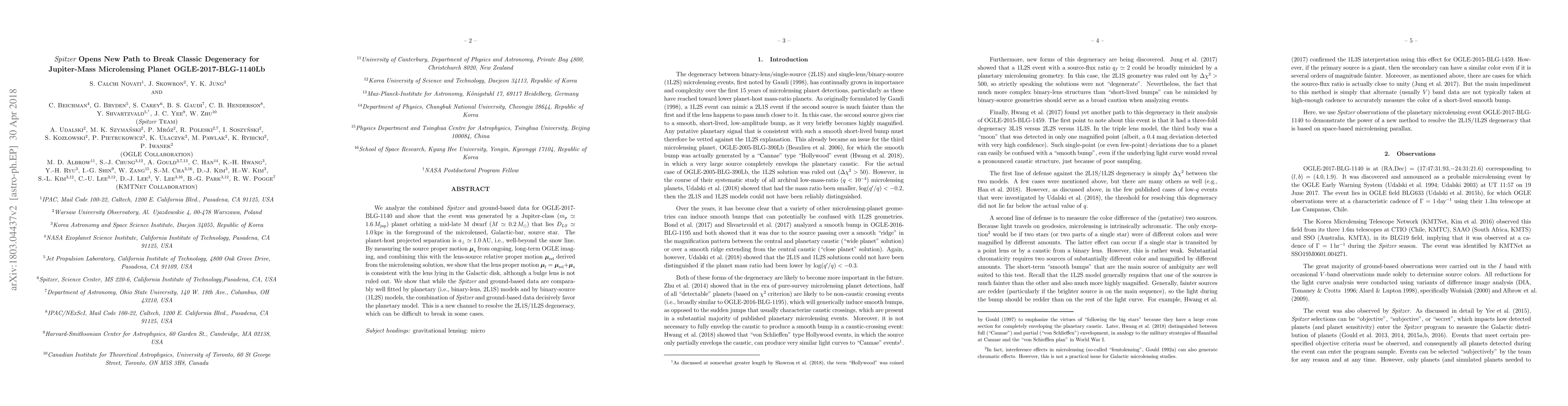 We analyze the combined Spitzer and ground-based data for OGLE-2017-BLG-1140 and show that the event was generated by a Jupiter-class $(m_p\simeq 1.6\,M_{\rm jup})$ planet orbiting a mid-late M dwarf $(M\simeq 0.2\,M_\odot)$ that lies $D_{LS}\simeq 1.0\,\mathrm{kpc}$ in the foreground of the microlensed, Galactic-bar, source star. The planet-host projected separation is $a_\perp \simeq 1.0\,\mathrm{au}$, i.e., well-beyond the snow line. By measuring the source proper motion ${\mathbf{\mu}}_s$ from ongoing, long-term OGLE imaging, and combining this with the lens-source relative proper motion ${\mathbf{\mu}}_\mathrm{rel}$ derived from the microlensing solution, we show that the lens proper motion ${\mathbf{\mu}}_l={\mathbf{\mu}}_\mathrm{rel} + {\mathbf{\mu}}_s$ is consistent with the lens lying in the Galactic disk, although a bulge lens is not ruled out. We show that while the Spitzer and ground-based data are comparably well fitted by planetary (i.e., binary-lens, 2L1S) models and by binary-source (1L2S) models, the combination of Spitzer and ground-based data decisively favor the planetary model. This is a new channel to resolve the 2L1S/1L2S degeneracy, which can be difficult to break in some cases.