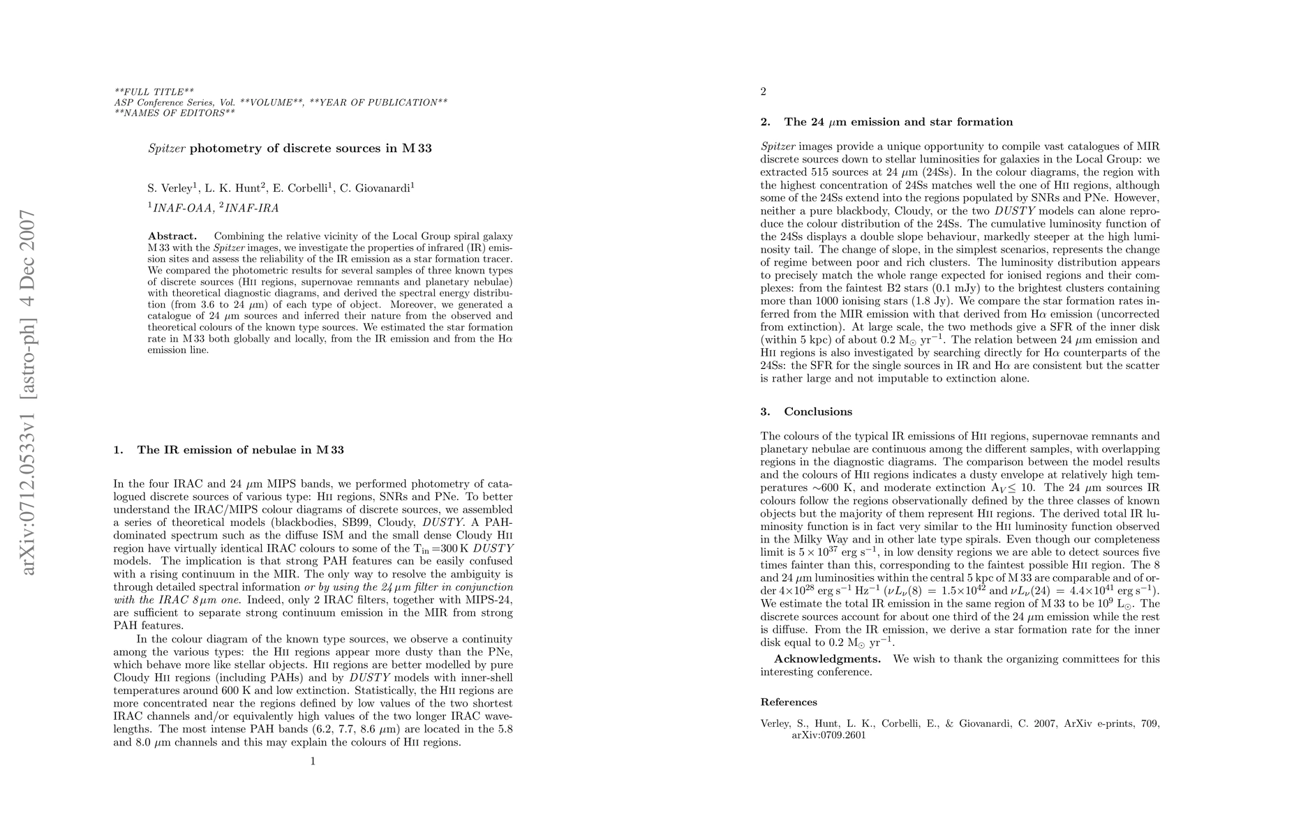 Combining the relative vicinity of the Local Group spiral galaxy M33 with the Spitzer images, we investigate the properties of infrared (IR) emission sites and assess the reliability of the IR emission as a star formation tracer. We compared the photometric results for several samples of three known types of discrete sources (HII regions, supernovae remnants and planetary nebulae) with theoretical diagnostic diagrams, and derived the spectral energy distribution (from 3.6 to 24 microns) of each type of object. Moreover, we generated a catalogue of 24 microns sources and inferred their nature from the observed and theoretical colours of the known type sources. We estimated the star formation rate in M33 both globally and locally, from the IR emission and from the Halpha emission line.