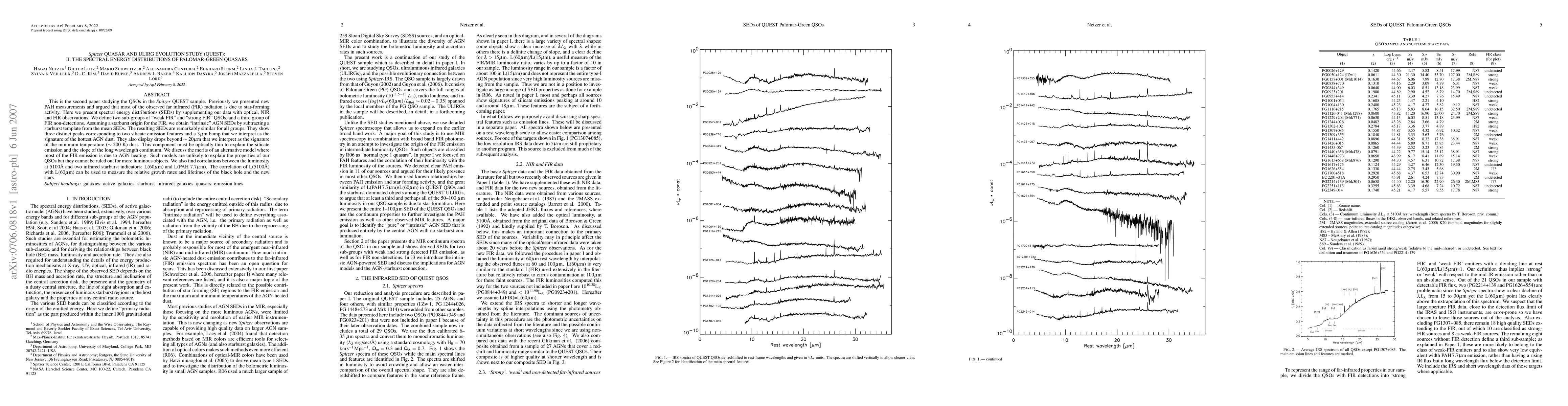 This is the second paper studying the QSOs in the spitzer QUEST sample. Previously we presented new PAH measurements and argued that most of the observed far infrared (FIR) radiation is due to star-forming activity. Here we present spectral energy distributions (SEDs) by supplementing our data with optical, NIR and FIR observations. We define two sub-groups of ``weak FIR'' and ``strong FIR'' QSOs, and a third group of FIR non-detections. Assuming a starburst origin for the FIR, we obtain ``intrinsic'' AGN SEDs by subtracting a starburst template from the mean SEDs. The resulting SEDs are remarkably similar for all groups. They show three distinct peaks corresponding to two silicate emission features and a 3mic bump that we interpret as the signature of the hottest AGN dust. They also display drops beyond 20mic that we interpret as the signature of the minimum temperature (about 200K) dust. This component must be optically thin to explain the silicate emission and the slope of the long wavelength continuum. We discuss the merits of an alternative model where most of the FIR emission is due to AGN heating. Such models are unlikely to explain the properties of our QSOs but they cannot be ruled out for more luminous objects. We also find correlations between the luminosity at 5100A and two infrared starburst indicators: L(60mic) and L(PAH 7.7mic). The correlation of L(5100A) with L(60mic) can be used to measure the relative growth rates and lifetimes of the black hole and the new stars.