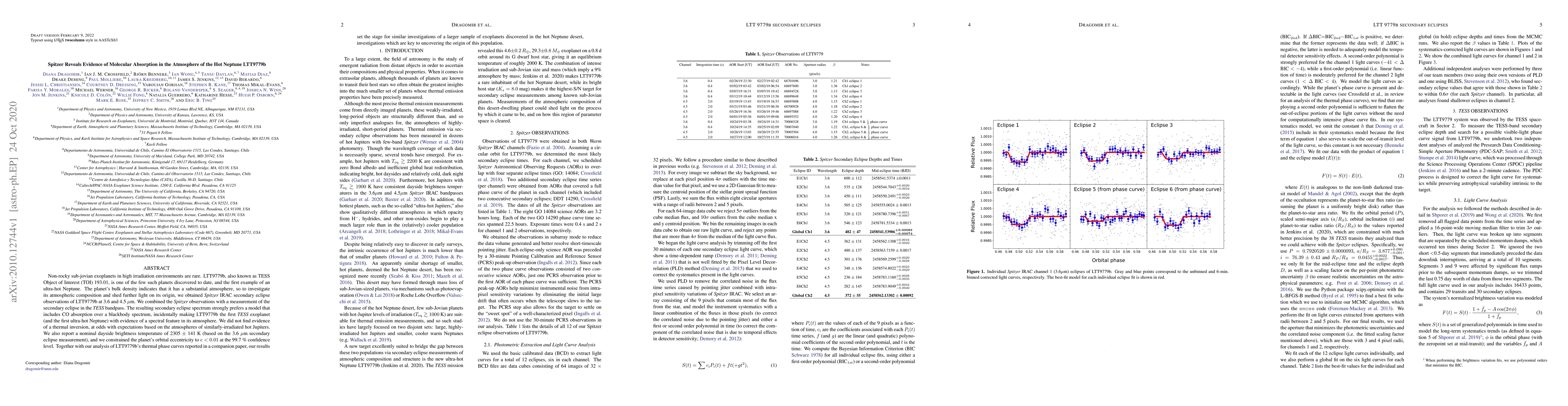 The Spitzer Space Telescope detected molecular absorption in the atmosphere of the ultra-hot Neptune LTT 9979b, revealing CO features and a nominal dayside brightness temperature of 2305 K, while constraining its orbital eccentricity to less than 0.01. This discovery marks the first spectral feature in the atmosphere of a TESS exoplanet.