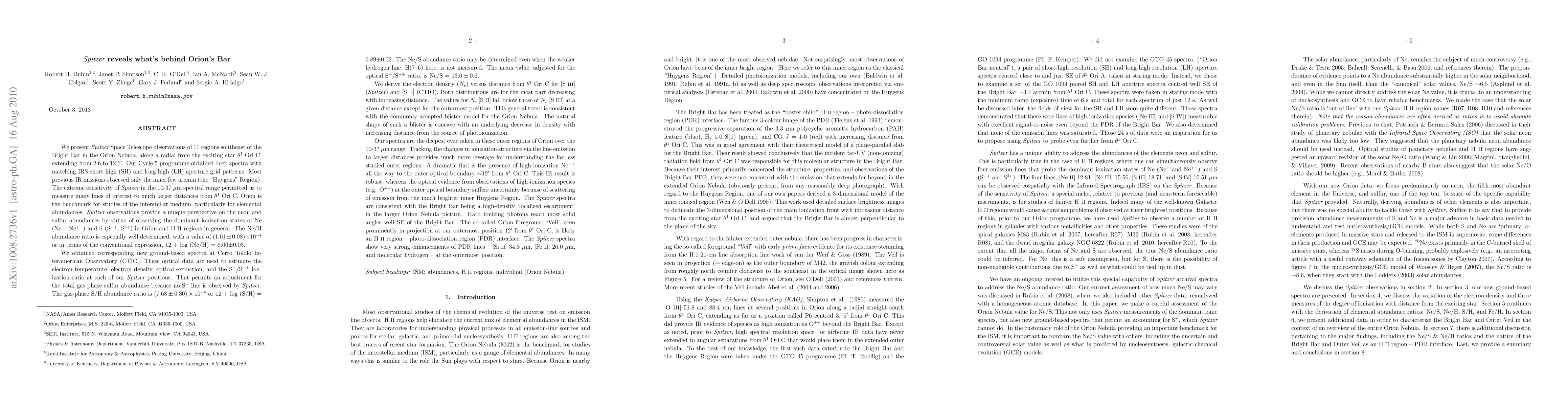 We present Spitzer Space Telescope observations of 11 regions SE of the Bright Bar in the Orion Nebula, along a radial from the exciting star theta1OriC, extending from 2.6 to 12.1'. Our Cycle 5 programme obtained deep spectra with matching IRS short-high (SH) and long-high (LH) aperture grid patterns. Most previous IR missions observed only the inner few arcmin. Orion is the benchmark for studies of the ISM particularly for elemental abundances. Spitzer observations provide a unique perspective on the Ne and S abundances by virtue of observing the dominant ionization states of Ne (Ne+, Ne++) and S (S++, S3+) in Orion and H II regions in general. The Ne/H abundance ratio is especially well determined, with a value of (1.01+/-0.08)E-4. We obtained corresponding new ground-based spectra at CTIO. These optical data are used to estimate the electron temperature, electron density, optical extinction, and the S+/S++ ratio at each of our Spitzer positions. That permits an adjustment for the total gas-phase S abundance because no S+ line is observed by Spitzer. The gas-phase S/H abundance ratio is (7.68+/-0.30)E-6. The Ne/S abundance ratio may be determined even when the weaker hydrogen line, H(7-6) here, is not measured. The mean value, adjusted for the optical S+/S++ ratio, is Ne/S = 13.0+/-0.6. We derive the electron density versus distance from theta1OriC for [S III] and [S II]. Both distributions are for the most part decreasing with increasing distance. A dramatic find is the presence of high-ionization Ne++ all the way to the outer optical boundary ~12' from theta1OriC. This IR result is robust, whereas the optical evidence from observations of high-ionization species (e.g. O++) at the outer optical boundary suffers uncertainty because of scattering of emission from the much brighter inner Huygens Region.