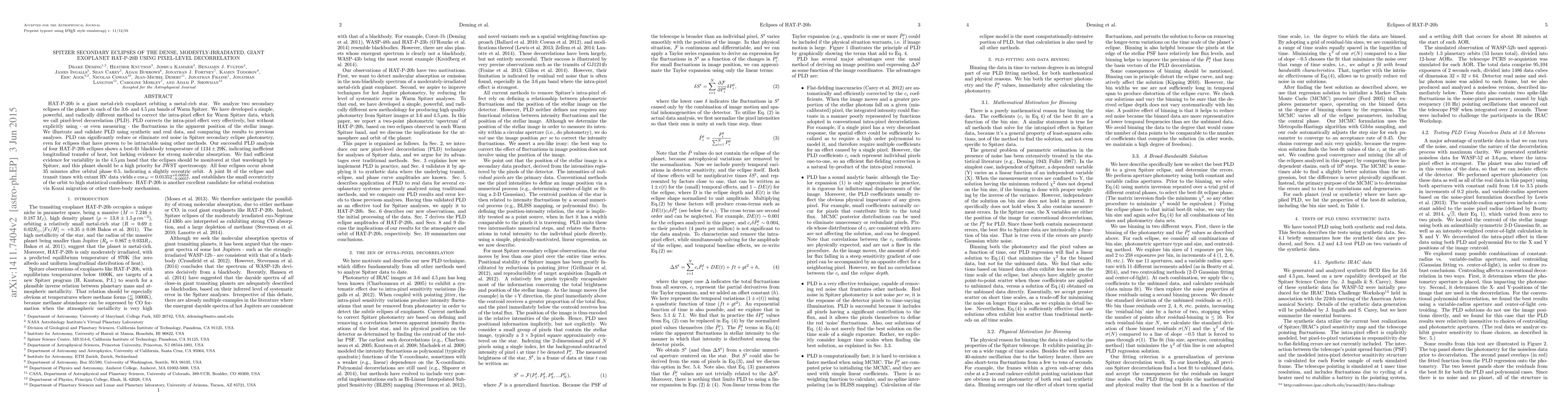 The Spitzer Space Telescope analyzed secondary eclipses of the dense exoplanet HAT-P-20b using a novel pixel-level decorrelation method to correct for detector sensitivity fluctuations. This analysis revealed a best-fit blackbody temperature of 1134 ± 29K, suggesting inefficient heat transfer and minimal molecular absorption, while indicating a slightly eccentric orbit.