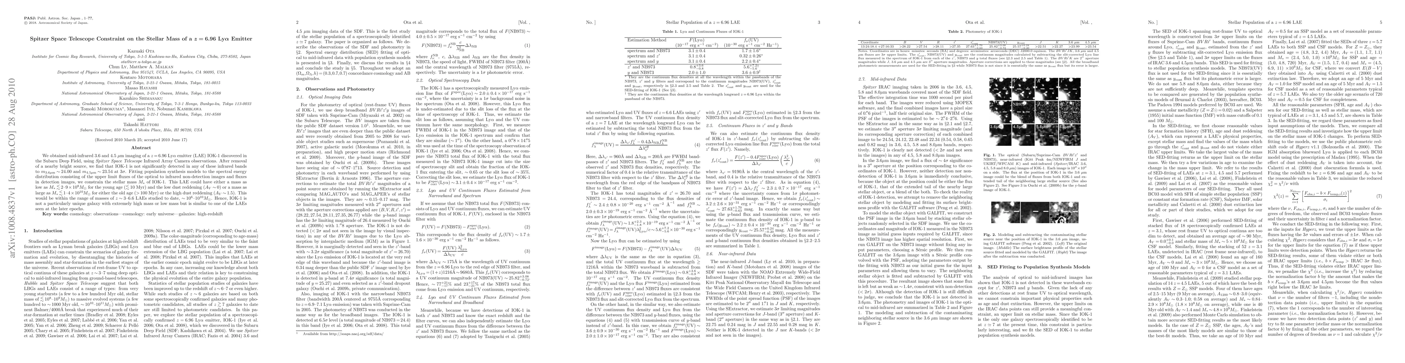 We obtained mid-infrared 3.6 and 4.5 micron imaging of a z=6.96 Lyman alpha emitter (LAE) IOK-1 discovered in the Subaru Deep Field, using Spitzer Space Telescope Infrared Array Camera observations. After removal of a nearby bright source, we find that IOK-1 is not significantly detected in any of these infrared bands to m_3.6 ~ 24.00 and m_4.5 ~ 23.54 at 3 sigma. Fitting population synthesis models to the spectral energy distribution consisting of the upper limit fluxes of the optical to infrared non-detection images and fluxes in detection images, we constrain the stellar mass M* of IOK-1. This LAE could have either a mass as low as M* <~ 2-9 x 10^8 Msun for the young age (<~ 10 Myr) and the low dust reddening (A_V ~ 0) or a mass as large as M* <~ 1-4 x 10^{10} Msun for either the old age (> 100 Myr) or the high dust reddening (A_V ~ 1.5). This would be within the range of masses of z ~ 3-6.6 LAEs studied to date, ~ 10^6-10^{10} Msun. Hence, IOK-1 is not a particularly unique galaxy with extremely high mass or low mass but is similar to one of the LAEs seen at the later epochs.