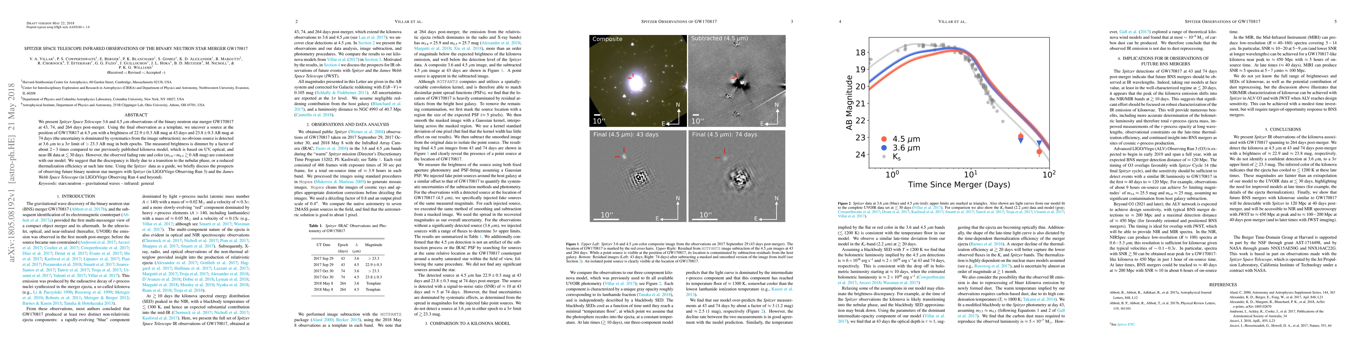 Spitzer Space Telescope observations of the binary neutron star merger GW170817 reveal a dimming infrared source at 4.5 microns, consistent with our kilonova model but dimmer by a factor of 2-3, suggesting a transition to the nebular phase or reduced thermalization efficiency.