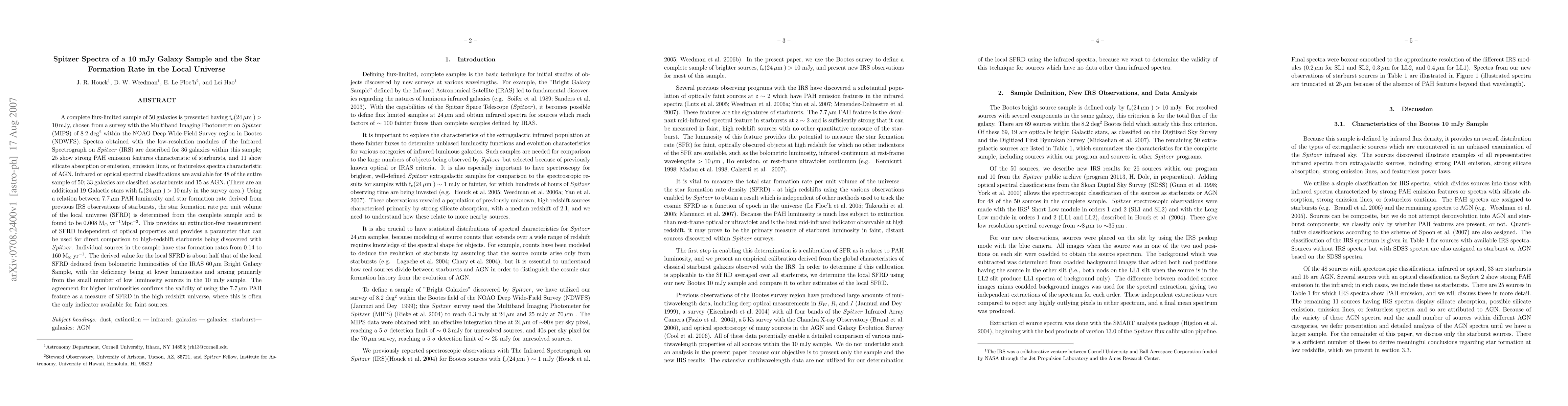 A complete flux-limited sample of 50 galaxies is presented having f_{\nu}(24um) > 10mJy, chosen from a survey with the Multiband Imaging Photometer on Spitzer (MIPS) of 8.2 deg^{2} within the NOAO Deep Wide-Field Survey region in Bootes (NDWFS). Spectra obtained with the low-resolution modules of the Infrared Spectrograph on Spitzer (IRS) are described for 36 galaxies within this sample; 25 show strong PAH emission features characteristic of starbursts, and 11 show silicate absorption or emission, emission lines, or featureless spectra characteristic of AGN. Infrared or optical spectral classifications are available for 48 of the entire sample of 50; 33 galaxies are classified as starbursts and 15 as AGN. (There are an additional 19 Galactic stars with f_{\nu}(24um) > 10mJy in the survey area.) Using a relation between 7.7um PAH luminosity and star formation rate derived from previous IRS observations of starbursts, the star formation rate per unit volume of the local universe (SFRD) is determined from the complete sample and is found to be 0.008 \mdot Mpc^{-3}. Individual sources in the sample have star formation rates from 0.14 to 160 \mdot. The derived value for the local SFRD is about half that of the local SFRD deduced from bolometric luminosities of the IRAS 60um Bright Galaxy Sample, with the deficiency being at lower luminosities and arising primarily from the small number of low luminosity sources in the 10 mJy sample. The agreement for higher luminosities confirms the validity of using the 7.7um PAH feature as a measure of SFRD in the high redshift universe, where this is often the only indicator available for faint sources.