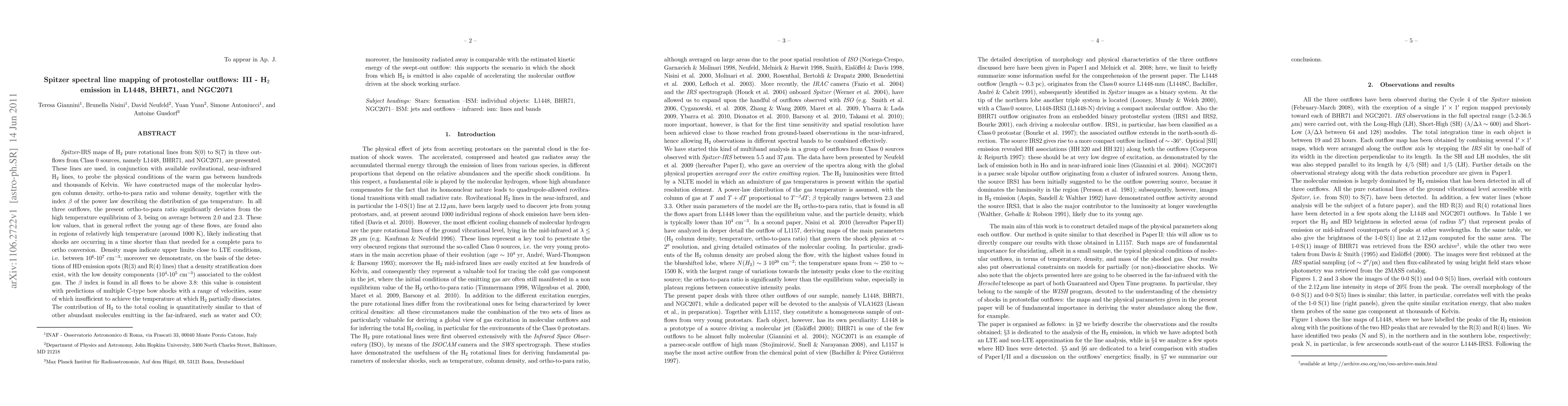 A study using Spitzer-IRS maps reveals that protostellar outflows have low ortho-to-para ratios of molecular hydrogen, indicating recent shocks and young flows, with density stratification and temperature distributions consistent with C-type bow shock models.