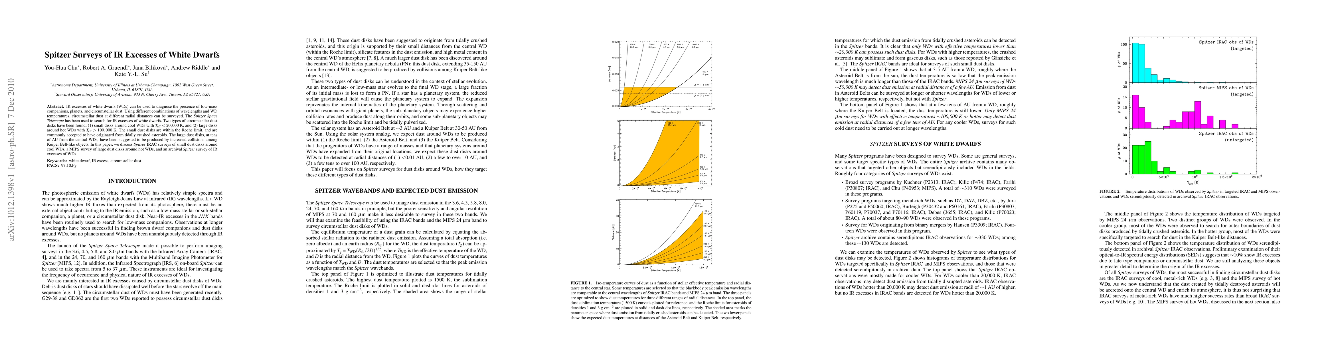 This paper uses Spitzer Space Telescope data to identify IR excesses in white dwarfs, revealing two types of circumstellar dust disks: small disks around cool WDs likely from tidally crushed asteroids, and large disks around hot WDs possibly from increased collisions among Kuiper Belt-like objects.