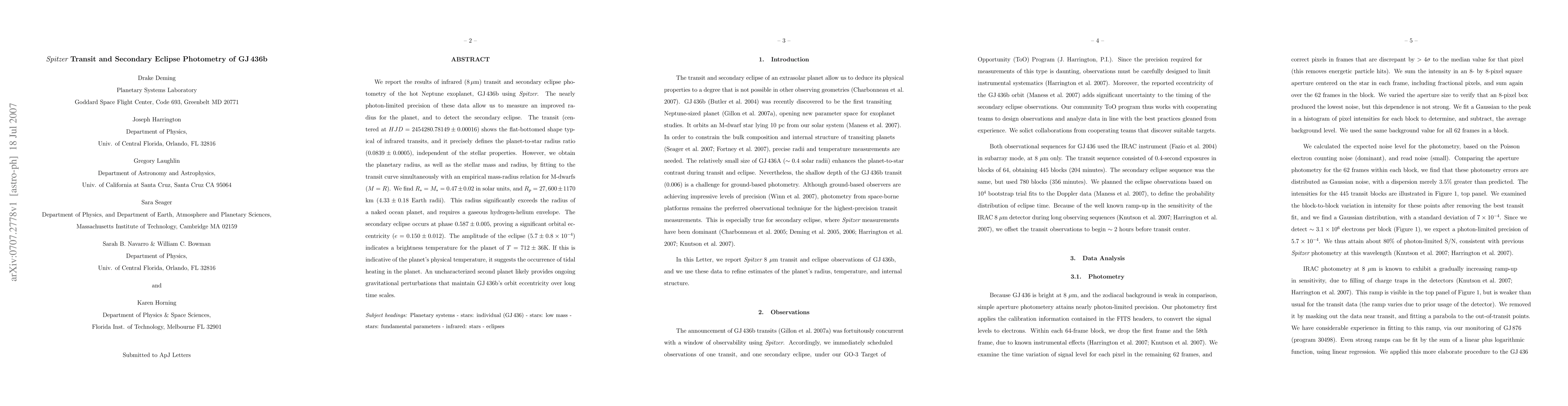 This study uses Spitzer to perform infrared transit and secondary eclipse photometry of the exoplanet GJ 436b, revealing a planetary radius of 4.33 Earth radii, indicating a gaseous hydrogen-helium envelope. The secondary eclipse suggests significant orbital eccentricity and tidal heating, with an inferred brightness temperature of 712K.