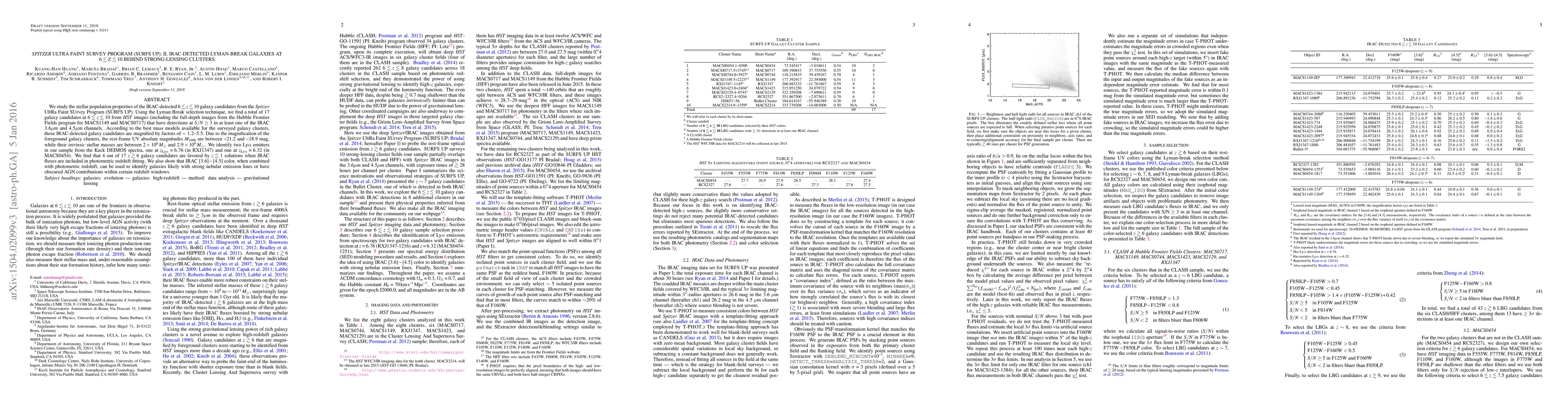 This study identifies 16 new Lyman-Break galaxies at $6 \lesssim z \lesssim 10$ behind strong-lensing clusters using the Spitzer SURFS UP survey, revealing a diverse stellar population ranging from evolved to very young galaxies. The IRAC $[3.6]-[4.5]$ color, combined with photometric redshift, effectively identifies galaxies with strong nebular emission lines.