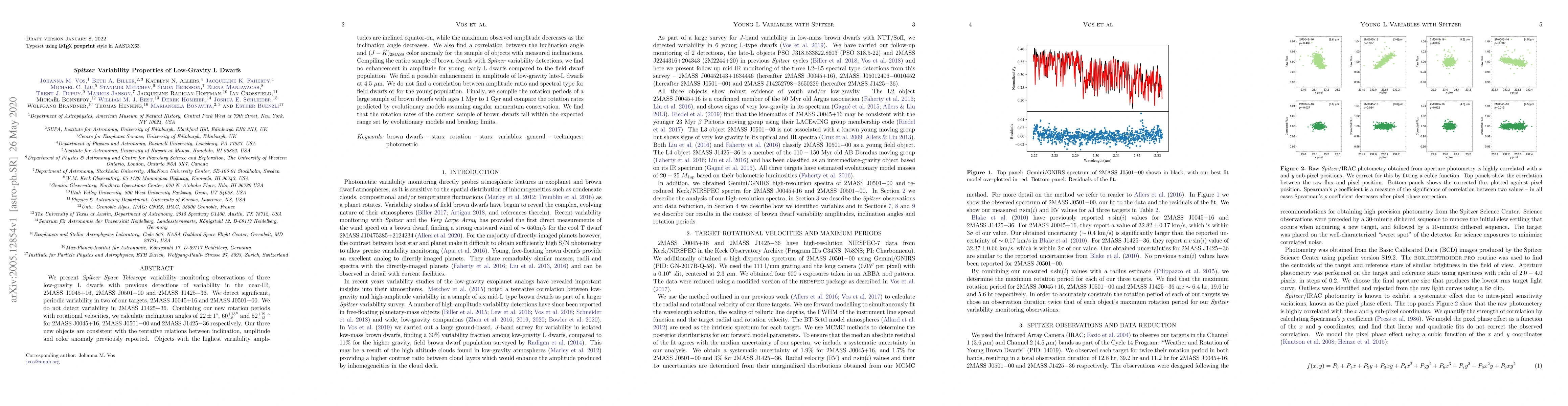 We present \textit{Spitzer Space Telescope} variability monitoring observations of three low-gravity L dwarfs with previous detections of variability in the near-IR, 2MASS J0045+16, 2MASS J0501-00 and 2MASS J1425-36. We detect significant, periodic variability in two of our targets, 2MASS J0045+16 and 2MASS J0501-00. We do not detect variability in 2MASS J1425-36. Combining our new rotation periods with rotational velocities, we calculate inclination angles of $22\pm1^{\circ}$, ${60^{+13 }_{-8}} ^{\circ}$ and $52^{+19}_{-13}~^{\circ}$ for 2MASS J0045+16, 2MASS J0501-00 and 2MASS J1425-36 respectively. Our three new objects are consistent with the tentative relations between inclination, amplitude and color anomaly previously reported. Objects with the highest variability amplitudes are inclined equator-on, while the maximum observed amplitude decreases as the inclination angle decreases. We also find a correlation between the inclination angle and $(J-K)_{\mathrm{2MASS}}$ color anomaly for the sample of objects with measured inclinations. Compiling the entire sample of brown dwarfs with \textit{Spitzer} variability detections, we find no enhancement in amplitude for young, early-L dwarfs compared to the field dwarf population. We find a possible enhancement in amplitude of low-gravity late-L dwarfs at $4.5~\mu$m. We do not find a correlation between amplitude ratio and spectral type for field dwarfs or for the young population. Finally, we compile the rotation periods of a large sample of brown dwarfs with ages 1 Myr to 1 Gyr and compare the rotation rates predicted by evolutionary models assuming angular momentum conservation. We find that the rotation rates of the current sample of brown dwarfs fall within the expected range set by evolutionary models and breakup limits.