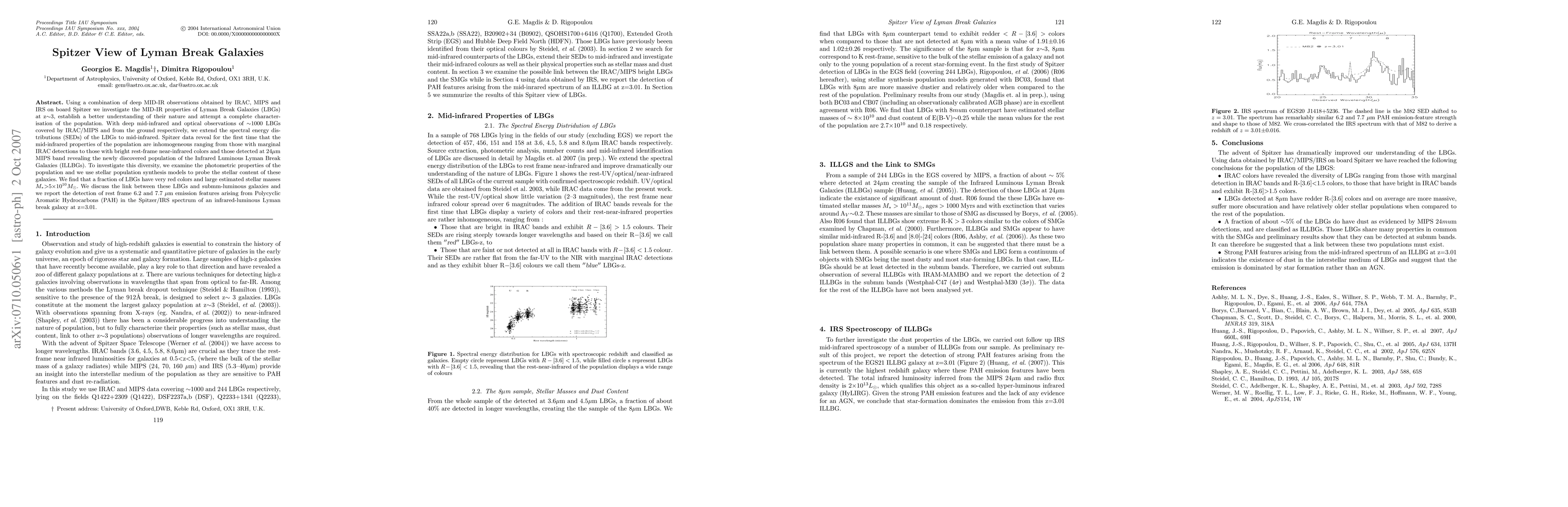 Using a combination of deep MID-IR observations obtained by IRAC, MIPS and IRS on board Spitzer we investigate the MID-IR properties of Lyman Break Galaxies (LBGs) at z~3, establish a better understanding of their nature and attempt a complete characterisation of the population. With deep mid-infrared and optical observations of ~1000 LBGs covered by IRAC/MIPS and from the ground respectively, we extend the spectral energy distributions (SEDs) of the LBGs to mid-infrared. Spitzer data reveal for the first time that the mid-infrared properties of the population are inhomogeneous ranging from those with marginal IRAC detections to those with bright rest-frame near-infrared colors and those detected at 24mu MIPS band revealing the newly discovered population of the Infrared Luminous Lyman Break Galaxies (ILLBGs). To investigate this diversity, we examine the photometric properties of the population and we use stellar population synthesis models to probe the stellar content of these galaxies. We find that a fraction of LBGs have very red colors and large estimated stellar masses M* > 5x10^10Mo. We discuss the link between these LBGs and submm-luminous galaxies and we report the detection of rest frame 6.2 and 7.7mu emission features arising from Polycyclic Aromatic Hydrocarbons (PAH) in the Spitzer/IRS spectrum of an infrared-luminous Lyman break galaxy at z=3.01.