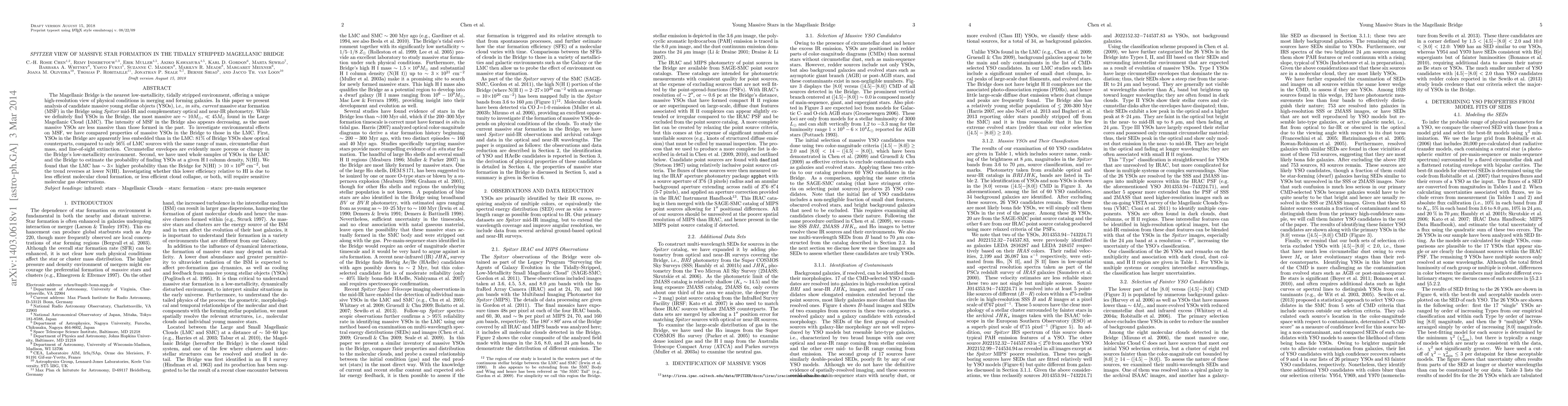 The Magellanic Bridge is the nearest low-metallicity, tidally stripped environment, offering a unique high-resolution view of physical conditions in merging and forming galaxies. In this paper we present analysis of candidate massive young stellar objects (YSOs), i.e., {\it in situ, current} massive star formation (MSF) in the Bridge using {\it Spitzer} mid-IR and complementary optical and near-IR photometry. While we definitely find YSOs in the Bridge, the most massive are $\sim10 M_\odot$, $\ll45 M_\odot$ found in the Large Magellanic Cloud (LMC). The intensity of MSF in the Bridge also appears decreasing, as the most massive YSOs are less massive than those formed in the past. To investigate environmental effects on MSF, we have compared properties of massive YSOs in the Bridge to those in the LMC. First, YSOs in the Bridge are apparently less embedded than in the LMC: 81% of Bridge YSOs show optical counterparts, compared to only 56% of LMC sources with the same range of mass, circumstellar dust mass, and line-of-sight extinction. Circumstellar envelopes are evidently more porous or clumpy in the Bridge's low-metallicity environment. Second, we have used whole samples of YSOs in the LMC and the Bridge to estimate the probability of finding YSOs at a given \hi\ column density, N(HI). We found that the LMC has $\sim3\times$ higher probability than the Bridge for N(HI) $>10\times10^{20}$ cm$^{-2}$, but the trend reverses at lower N(HI). Investigating whether this lower efficiency relative to HI is due to less efficient molecular cloud formation, or less efficient cloud collapse, or both, will require sensitive molecular gas observations.