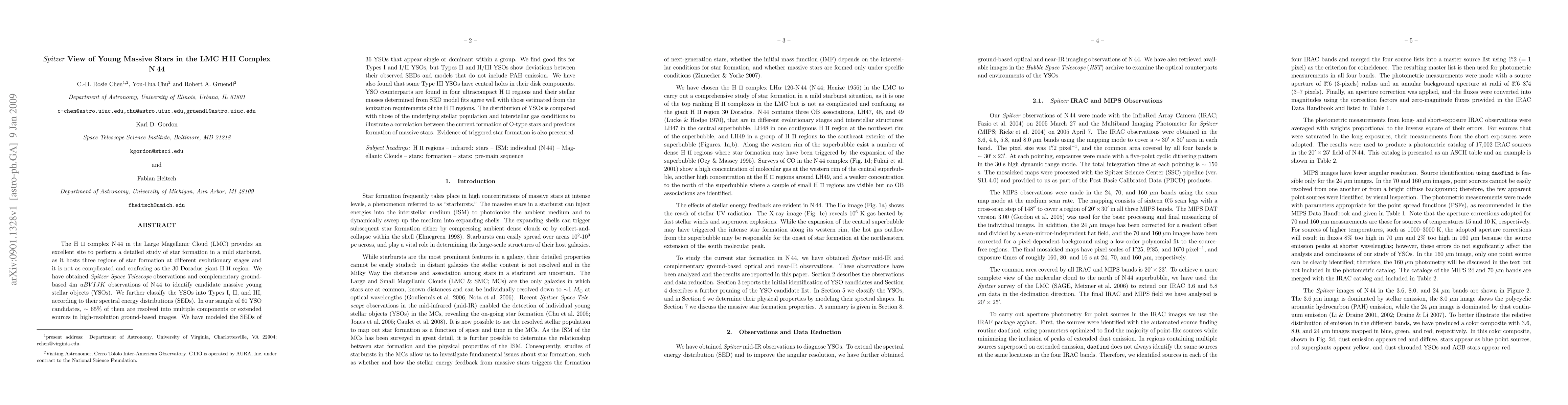 The Spitzer Space Telescope and ground-based observations of the LMC HII complex N44 reveal three distinct star-forming regions, identifying 60 young stellar object (YSO) candidates. The YSOs are classified into Types I, II, and III based on their spectral energy distributions, with many showing multiple components or extended sources. Modeling indicates that Types I and I/II YSOs fit well with models, while Types II and II/III show deviations requiring PAH emission. The study finds evidence of triggered star formation correlating with the distribution of O-type stars and previous massive star formation.