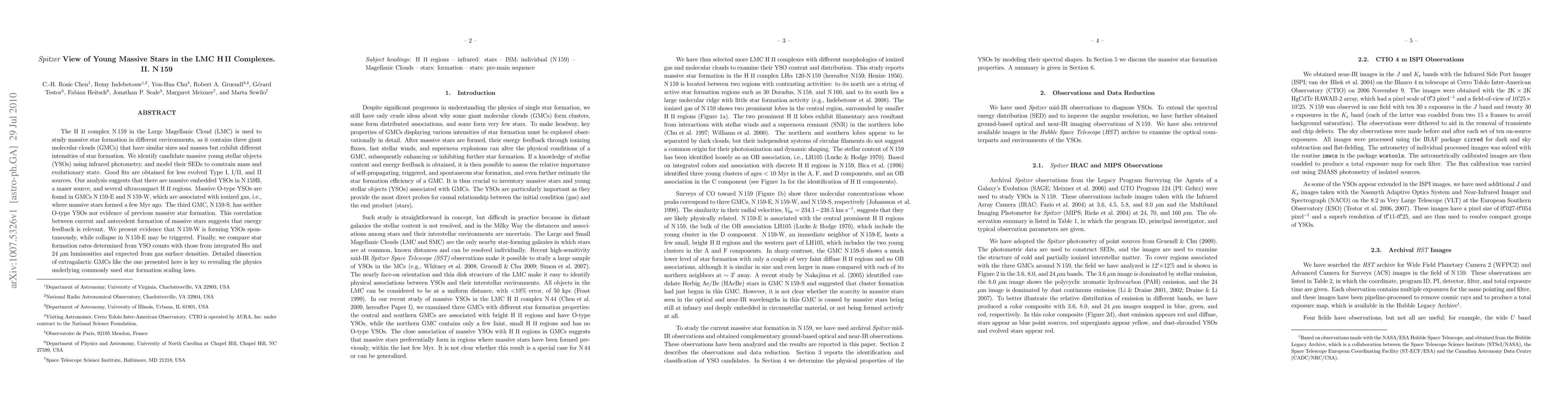 This paper examines the HII complex N159 in the LMC to study massive star formation across different environments, identifying young stellar objects using infrared data. It finds that while GMCs N159-E and N159-W show evidence of recent massive star formation, N159-S does not, suggesting that energy feedback from massive stars influences star formation rates.