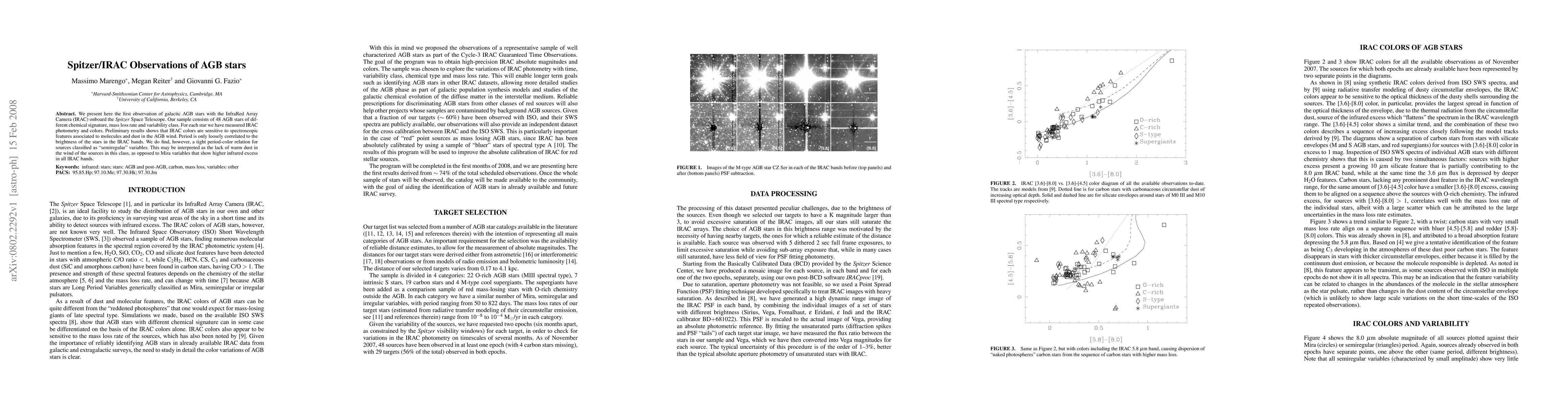 We present here the first observation of galactic AGB stars with the InfraRed Array Camera (IRAC) onboard the Spitzer Space Telescope. Our sample consists of 48 AGB stars of different chemical signature, mass loss rate and variability class. For each star we have measured IRAC photometry and colors. Preliminary results shows that IRAC colors are sensitive to spectroscopic features associated to molecules and dust in the AGB wind. Period is only loosely correlated to the brightness of the stars in the IRAC bands. We do find, however, a tight period-color relation for sources classified as semiregular variables. This may be interpreted as the lack of warm dust in the wind of the sources in this class, as opposed to Mira variables that show higher infrared excess in all IRAC bands.