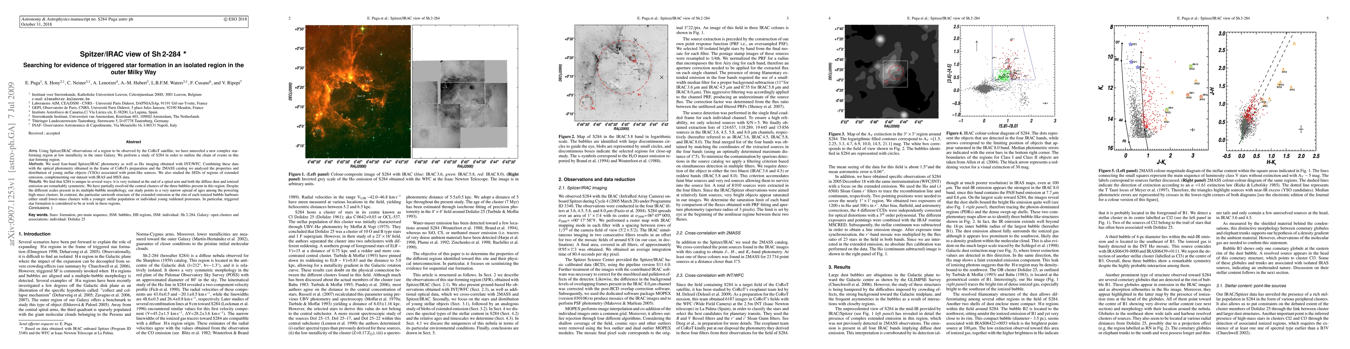 Using Spitzer/IRAC observations of a region to be observed by the CoRoT satellite, we have unraveled a new complex star-forming region at low metallicity in the outer Galaxy. We perform a study of S284 in order to outline the chain of events in this star-forming region. We used four-band Spitzer/IRAC photometry as well as Halpha imaging obtained with INT/WFC. Combining these data with the optical photometry obtained in the frame of CoRoTs preparation and the 2MASS catalog we analysed the properties and distribution of young stellar objects (YSOs) associated with point-like sources. We also studied the SEDs of regions of extended emission, complementing our dataset with IRAS and MSX data. We find that S284 is unique in several ways: it is very isolated at the end of a spiral arm and both the diffuse dust and ionized emission are remarkably symmetric. We have partially resolved the central clusters of the three bubbles present in this region. Despite the different scales present in its multiple-bubble morphology, our study points to a very narrow spread of ages among the powering high-mass clusters. In contrast, the particular sawtooth structure of the extended emission at the rim of each ionized bubble harbours either small lower-mass clusters with a younger stellar population or individual young reddened protostars. In particular, triggered star formation is considered to be at work in these regions.