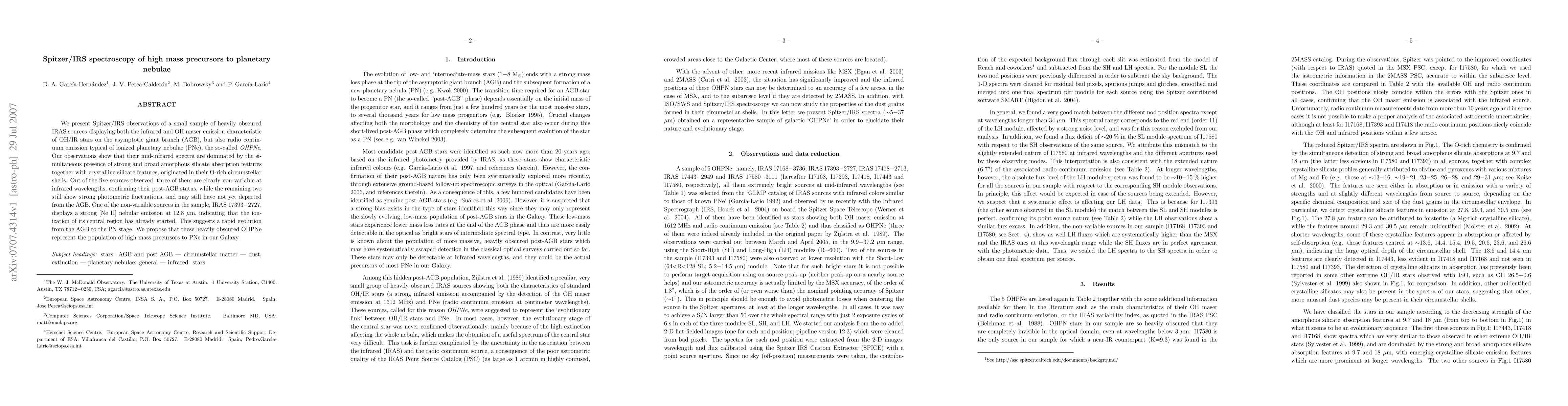 We present Spitzer/IRS observations of a small sample of heavily obscured IRAS sources displaying both the infrared and OH maser emission characteristic of OH/IR stars on the asymptotic giant branch (AGB), but also radio continuum emission typical of ionized planetary nebulae (PNe), the so-called OHPNe. Our observations show that their mid-infrared spectra are dominated by the simultaneous presence of strong and broad amorphous silicate absorption features together with crystalline silicate features, originated in their O-rich circumstellar shells. Out of the five sources observed, three of them are clearly non-variable at infrared wavelengths, confirming their post-AGB status, while the remaining two still show strong photometric fluctuations, and may still have not yet departed from the AGB. One of the non-variable sources in the sample, IRAS 17393-2727, displays a strong [Ne II] nebular emission at 12.8 microns, indicating that the ionization of its central region has already started. This suggests a rapid evolution from the AGB to the PN stage. We propose that these heavily obscured OHPNe represent the population of high mass precursors to PNe in our Galaxy.