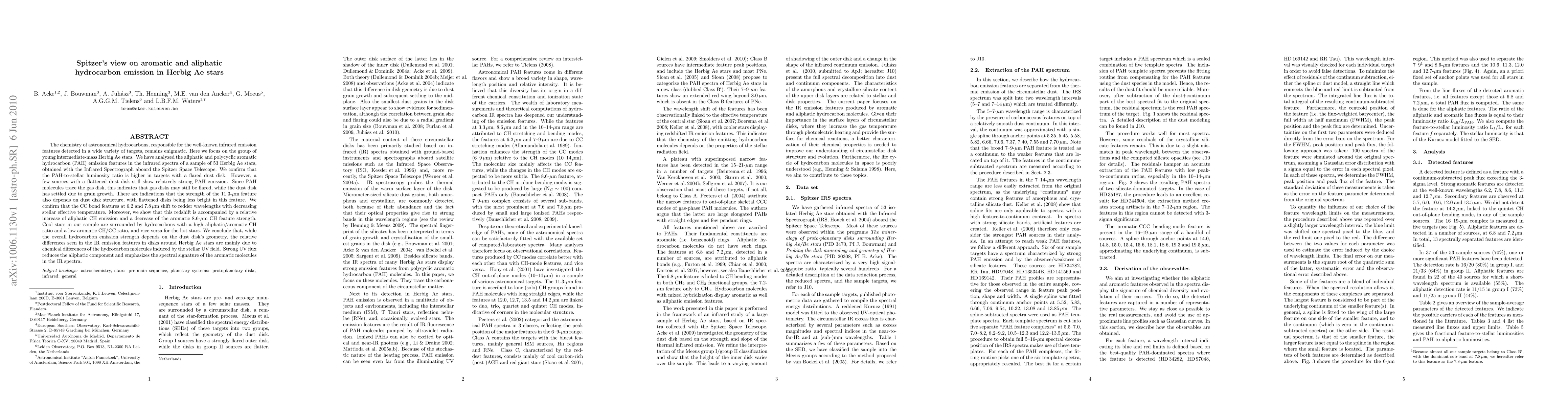 The paper presents a detailed analysis of infrared spectra from Spitzer Space Telescope, identifying and quantifying the emission features of aliphatic and PAH hydrocarbons in Herbig Ae stars, and correlating them with stellar and disk properties.
