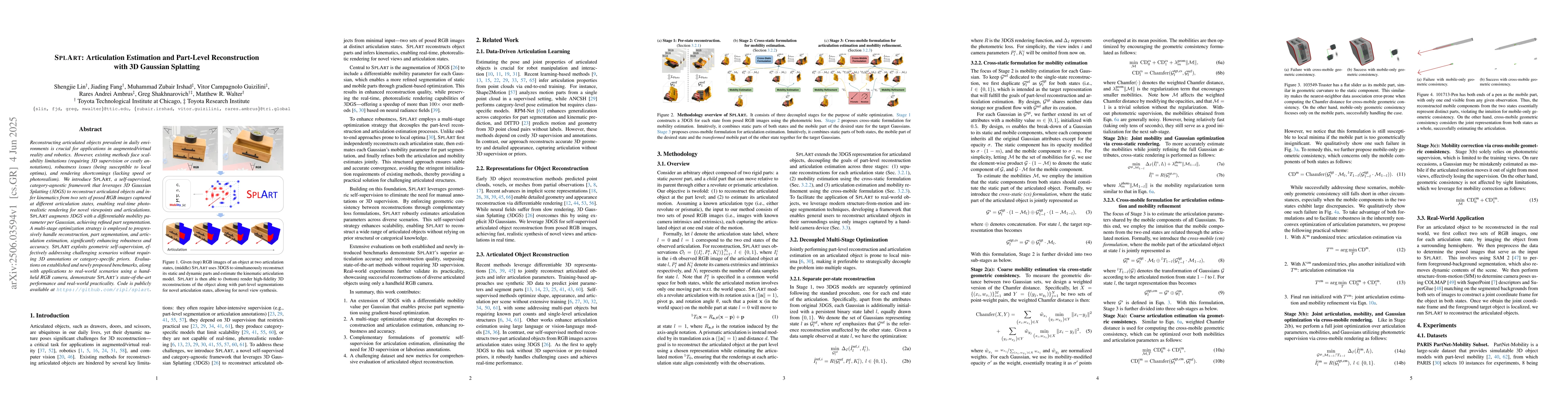 SplArt is a self-supervised, category-agnostic framework that uses 3D Gaussian Splatting (3DGS) to reconstruct articulated objects and infer kinematics from two sets of posed RGB images at different articulation states. It introduces a differentiable mobility parameter per Gaussian for refined part segmentation and employs a multi-stage optimization strategy for reconstruction, part segmentation, and articulation estimation.