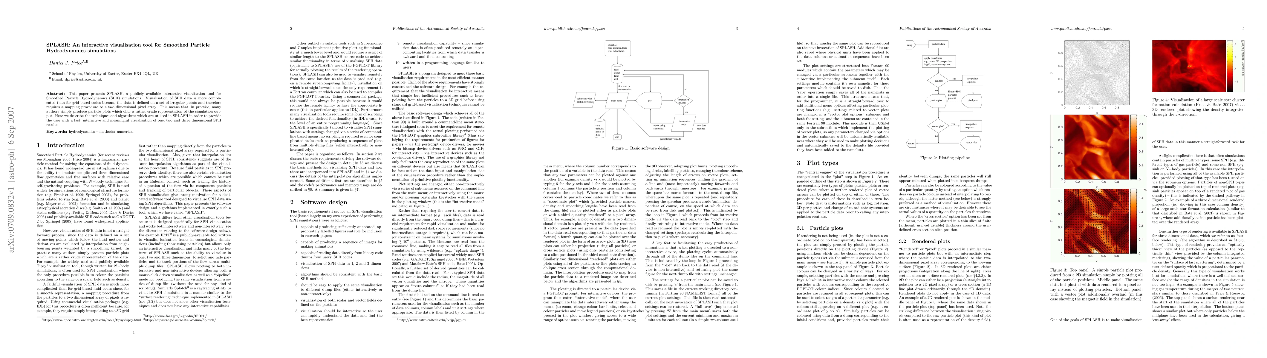 SPLASH is an interactive visualisation tool for Smoothed Particle Hydrodynamics (SPH) simulations, addressing the complexity of visualising irregular particle data through advanced mapping techniques. It offers fast, interactive, and meaningful visualisations of one, two, and three-dimensional SPH results.