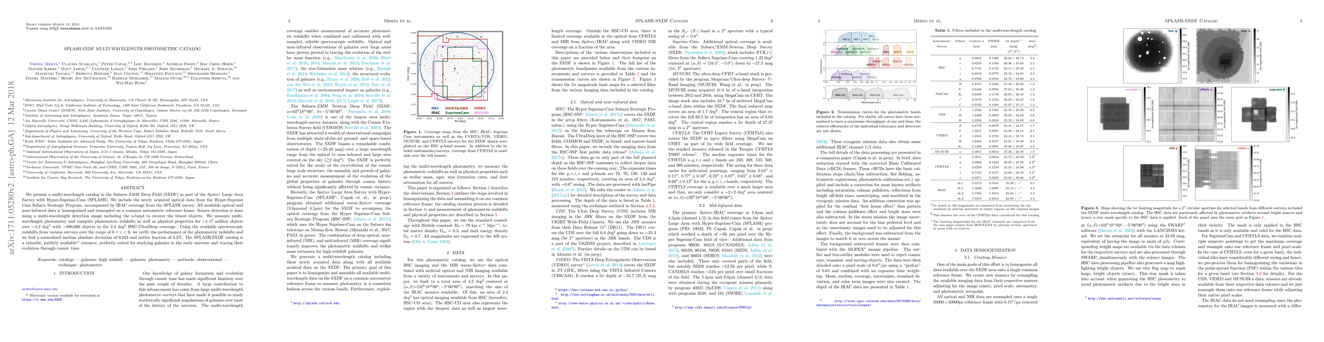 The SPLASH-SXDF catalog compiles multi-wavelength data from optical to near-infrared in the Subaru-XMM Deep Field, providing photometric redshifts and stellar masses for over 1.17 million objects. It serves as a valuable resource for studying early universe galaxies and their evolution.
