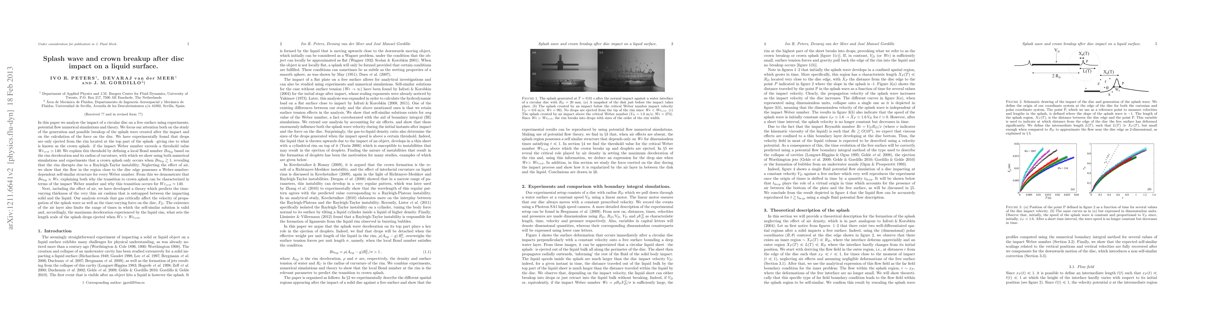 This paper investigates the dynamics of splash waves and crown breakup following a circular disc's impact on a liquid surface. It reveals that crown splash occurs when the impact Weber number exceeds 140, driven by a Rayleigh-Taylor instability, and develops a theory for the air cushion's effect on splash wave propagation and disc force.