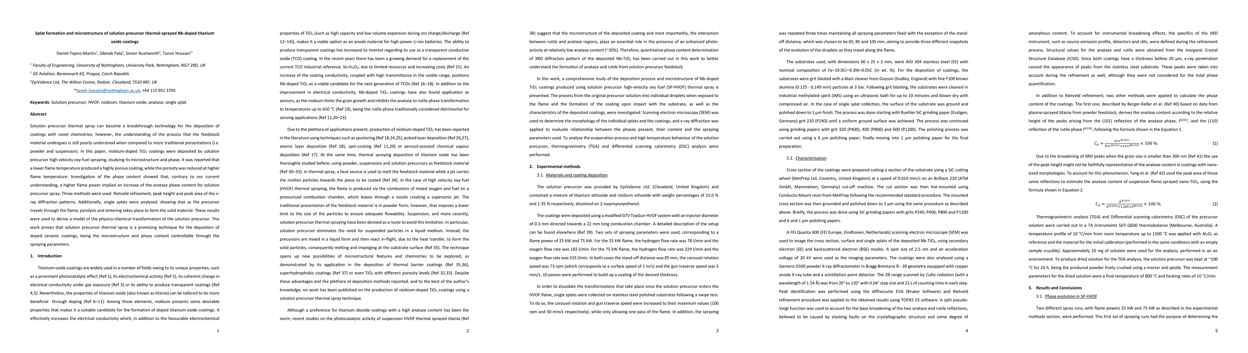 This paper investigates the microstructure and phase formation in Nb-doped TiO2 coatings deposited via solution precursor thermal spray, revealing that lower flame temperatures yield highly porous coatings while higher temperatures increase anatase phase content contrary to traditional understanding. The study uses x-ray diffraction and splat analysis to model the transformation process.