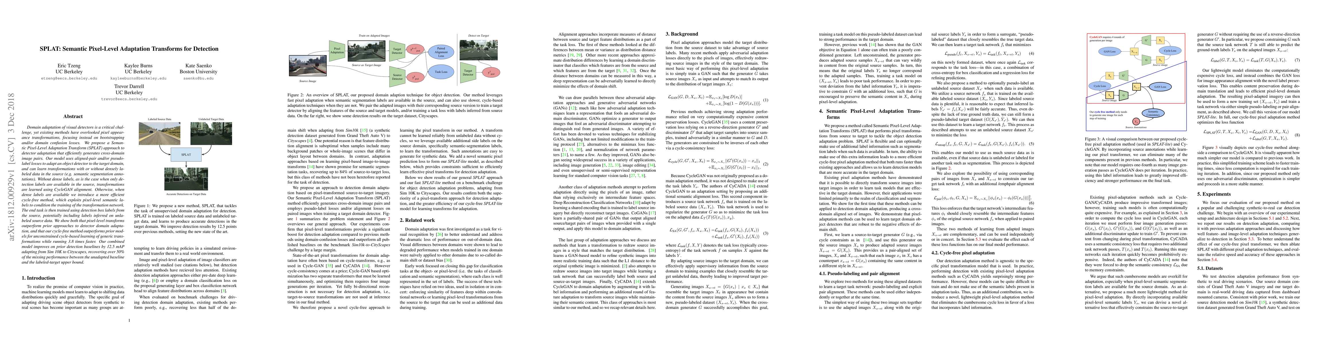 Domain adaptation of visual detectors is a critical challenge, yet existing methods have overlooked pixel appearance transformations, focusing instead on bootstrapping and/or domain confusion losses. We propose a Semantic Pixel-Level Adaptation Transform (SPLAT) approach to detector adaptation that efficiently generates cross-domain image pairs. Our model uses aligned-pair and/or pseudo-label losses to adapt an object detector to the target domain, and can learn transformations with or without densely labeled data in the source (e.g. semantic segmentation annotations). Without dense labels, as is the case when only detection labels are available in the source, transformations are learned using CycleGAN alignment. Otherwise, when dense labels are available we introduce a more efficient cycle-free method, which exploits pixel-level semantic labels to condition the training of the transformation network. The end task is then trained using detection box labels from the source, potentially including labels inferred on unlabeled source data. We show both that pixel-level transforms outperform prior approaches to detector domain adaptation, and that our cycle-free method outperforms prior models for unconstrained cycle-based learning of generic transformations while running 3.8 times faster. Our combined model improves on prior detection baselines by 12.5 mAP adapting from Sim 10K to Cityscapes, recovering over 50% of the missing performance between the unadapted baseline and the labeled-target upper bound.