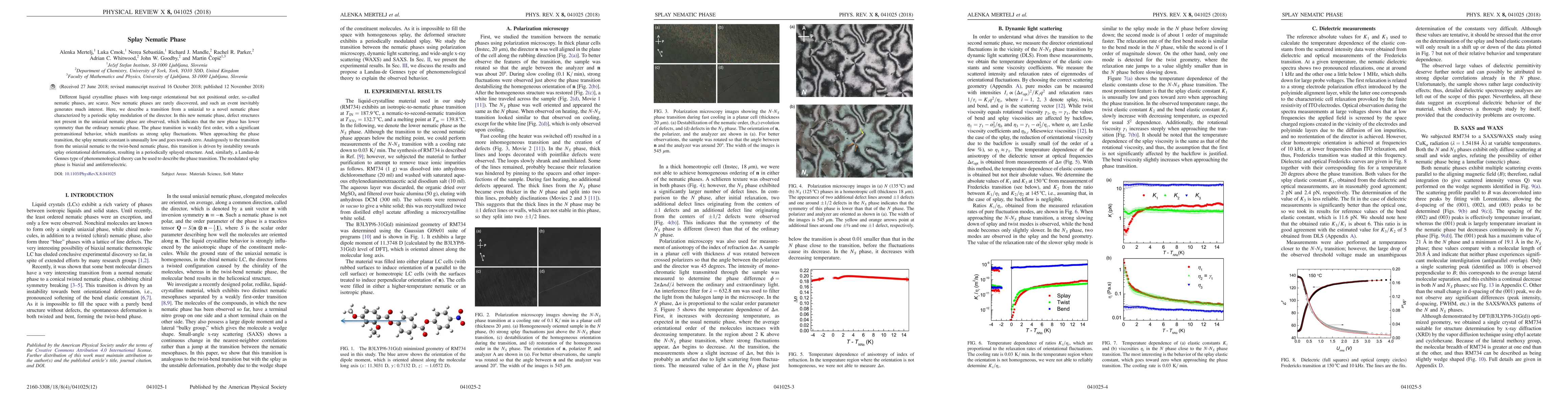 Different liquid crystalline phases with long-range orientational but not positional order, so-called nematic phases, are scarce. It rarely occurs that a new nematic phase is discovered and such event is inevitably accompanied by a great interest. Here, we describe a transition from uniaxial to novel nematic phase characterized by a periodic splay modulation of the director. In this new nematic phase, defect structures not present in the uniaxial nematic are observed, which indicates that the new phase has lower symmetry than the ordinary nematic phase. The phase transition is weakly first order with a significant pretransitional behavior, which manifests as strong splay fluctuations. When approaching the phase transition, the splay nematic constant is unusually low and goes towards zero. Analogously to the transition from the uniaxial nematic to the twist-bend nematic phase, this transition is driven by instability towards splay orientational deformation, resulting in a periodically splayed structure. And, similarly, a Landau-de Gennes type of phenomenological theory can be used to describe the phase transition. The modulated splay phase is biaxial and antiferroelectric.