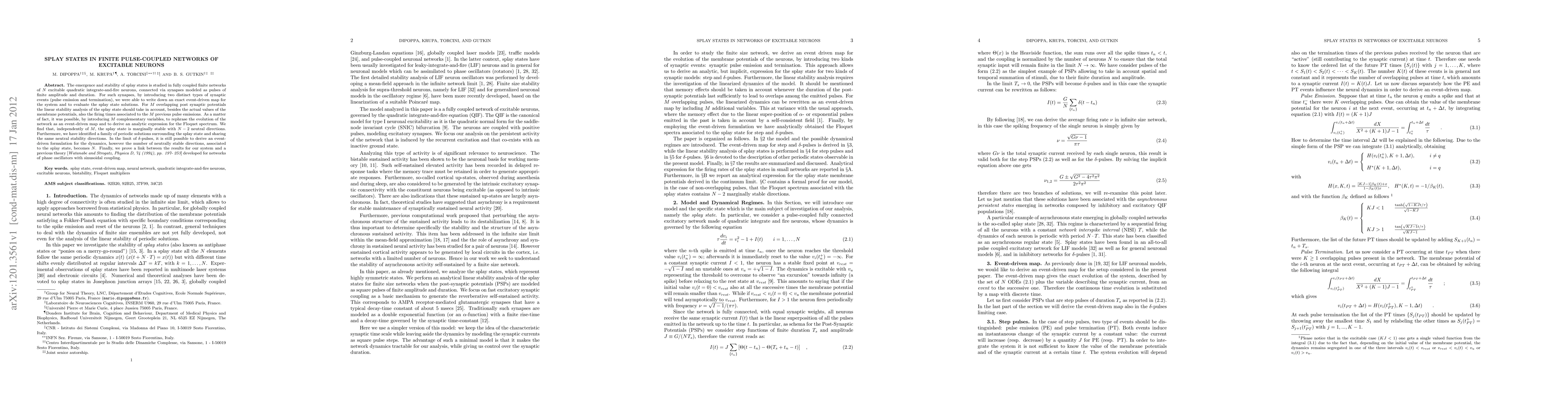 The emergence and stability of splay states is studied in fully coupled finite networks of N excitable quadratic integrate-and-fire neurons, connected via synapses modeled as pulses of finite amplitude and duration. For such synapses, by introducing two distinct types of synaptic events (pulse emission and termination), we were able to write down an exact event-driven map for the system and to evaluate the splay state solutions. For M overlapping post synaptic potentials the linear stability analysis of the splay state should take in account, besides the actual values of the membrane potentials, also the firing times associated to the M previous pulse emissions. As a matter of fact, it was possible, by introducing M complementary variables, to rephrase the evolution of the network as an event-driven map and to derive an analytic expression for the Floquet spectrum. We find that, independently of M, the splay state is marginally stable with N-2 neutral directions. Furthermore, we have identified a family of periodic solutions surrounding the splay state and sharing the same neutral stability directions. In the limit of $\delta$-pulses, it is still possible to derive an event-driven formulation for the dynamics, however the number of neutrally stable directions, associated to the splay state, becomes N. Finally, we prove a link between the results for our system and a previous theory [Watanabe and Strogatz, Physica D, 74 (1994), pp. 197- 253] developed for networks of phase oscillators with sinusoidal coupling.
