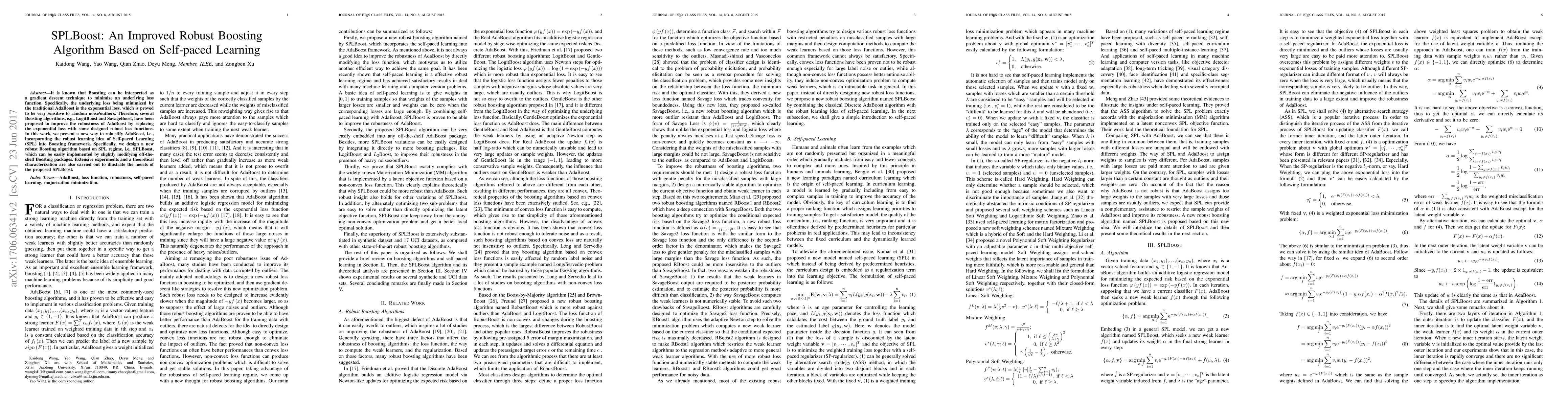 A new Boosting algorithm called SPLBoost is proposed to improve the robustness of AdaBoost by incorporating self-paced learning, which can effectively handle random noise and outliers. Extensive experiments demonstrate its merits.