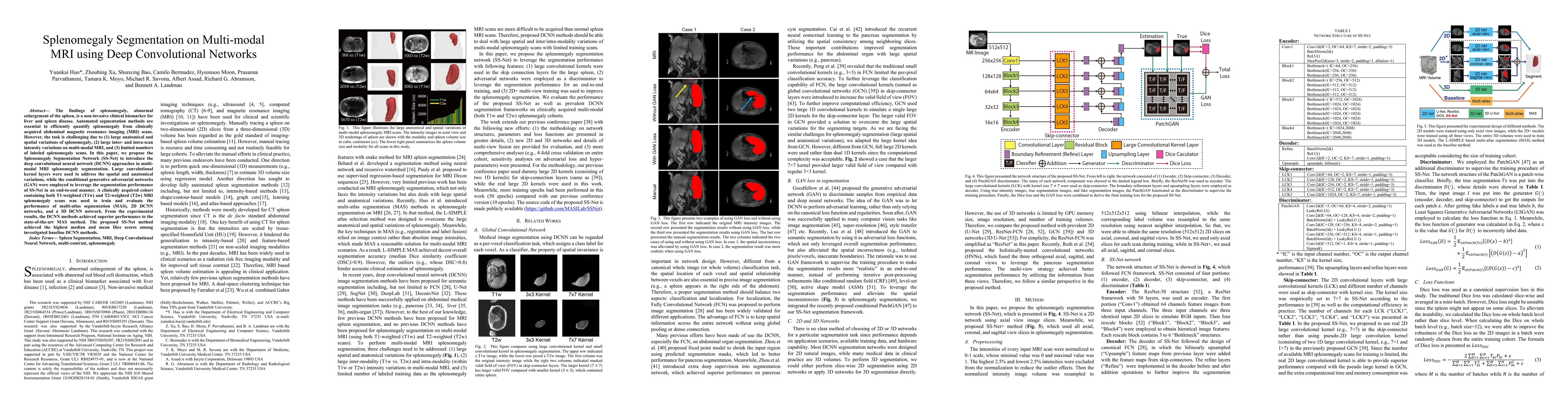 This paper proposes the Splenomegaly Segmentation Network (SS-Net) using deep convolutional neural networks (DCNN) to efficiently segment splenomegaly from multi-modal MRI scans, achieving superior performance over traditional multi-atlas segmentation methods. The SS-Net incorporates large convolutional kernels and conditional GANs to address anatomical variations and intensity differences.