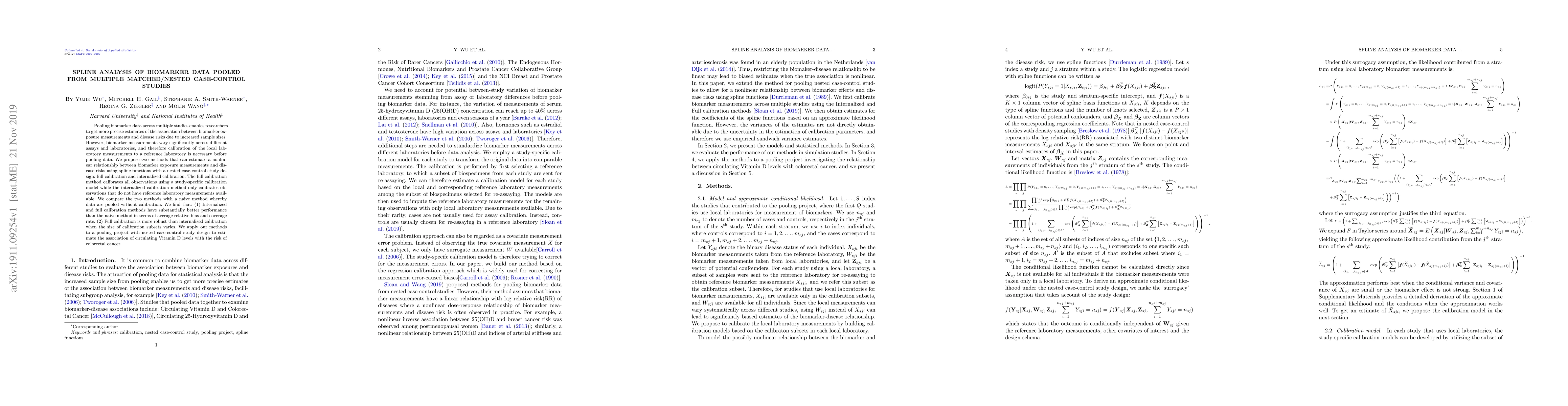Pooling biomarker data across multiple studies enables researchers to get more precise estimates of the association between biomarker exposure measurements and disease risks due to increased sample sizes. However, biomarker measurements vary significantly across different assays and laboratories, and therefore calibration of the local laboratory measurements to a reference laboratory is necessary before pooling data. We propose two methods that can estimate a nonlinear relationship between biomarker exposure measurements and disease risks using spline functions with a nested case-control study design: full calibration and internalized calibration. The full calibration method calibrates all observations using a study-specific calibration model while the internalized calibration method only calibrates observations that do not have reference laboratory measurements available. We compare the two methods with a naive method whereby data are pooled without calibration. We find that: (1) Internalized and full calibration methods have substantially better performance than the naive method in terms of average relative bias and coverage rate. (2) Full calibration is more robust than internalized calibration when the size of calibration subsets varies. We apply our methods to a pooling project with nested case-control study design to estimate the association of circulating Vitamin D levels with the risk of colorectal cancer.