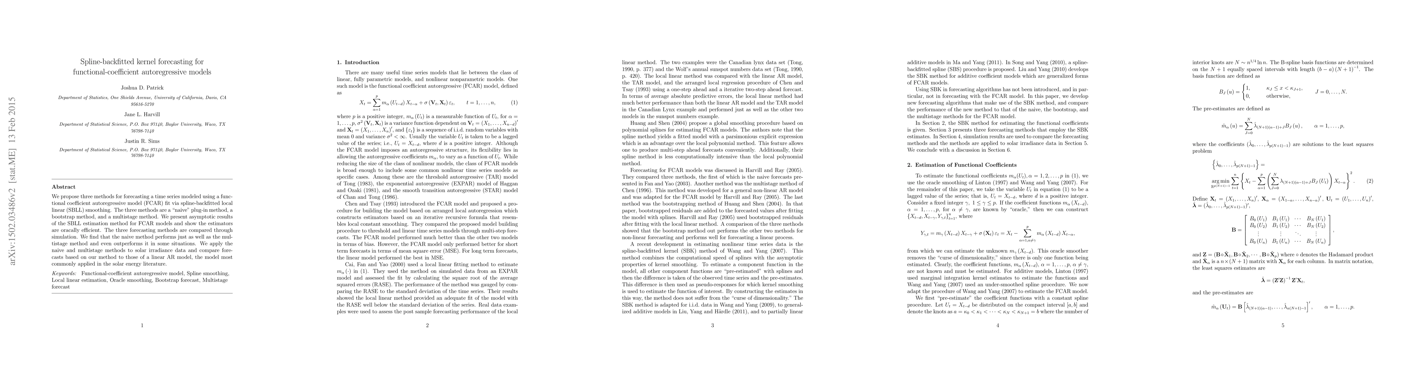 This paper proposes three forecasting methods for time series in functional coefficient autoregressive models, using spline-backfitted local linear smoothing. The methods are 'naive' plug-in, bootstrap, and multistage. Simulation results show the naive method performs comparably and sometimes better than the multistage method. The methods are applied to solar irradiance data, outperforming linear AR models commonly used in solar energy literature.