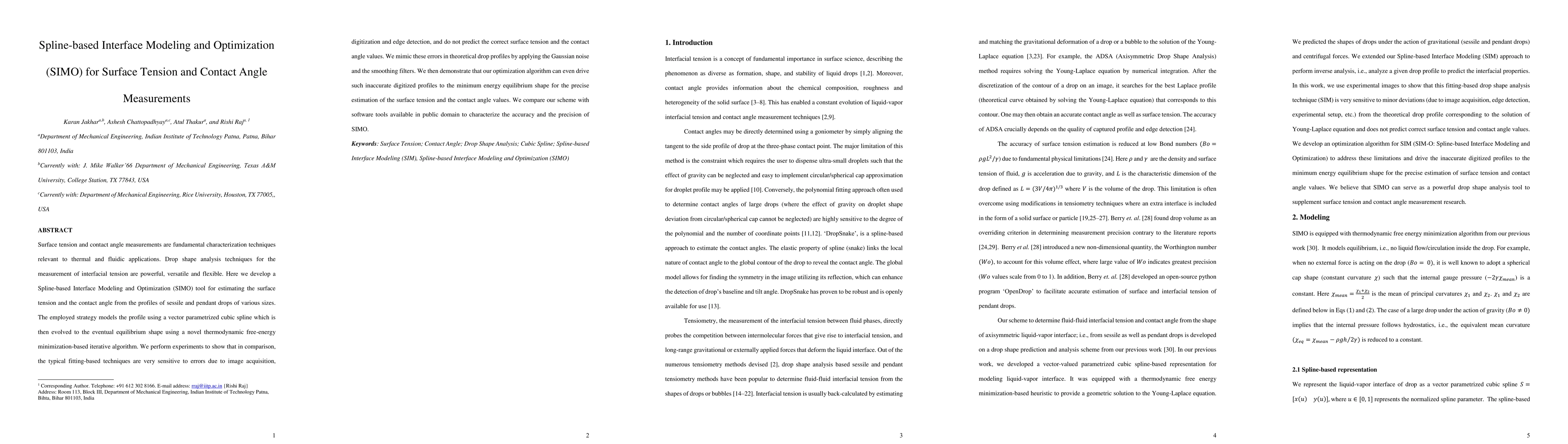 The SIMO tool uses a vector parametrized cubic spline and a thermodynamic free-energy minimization algorithm to estimate surface tension and contact angles from drop profiles, demonstrating greater accuracy compared to traditional fitting-based techniques, even in the presence of digitization and edge detection errors.