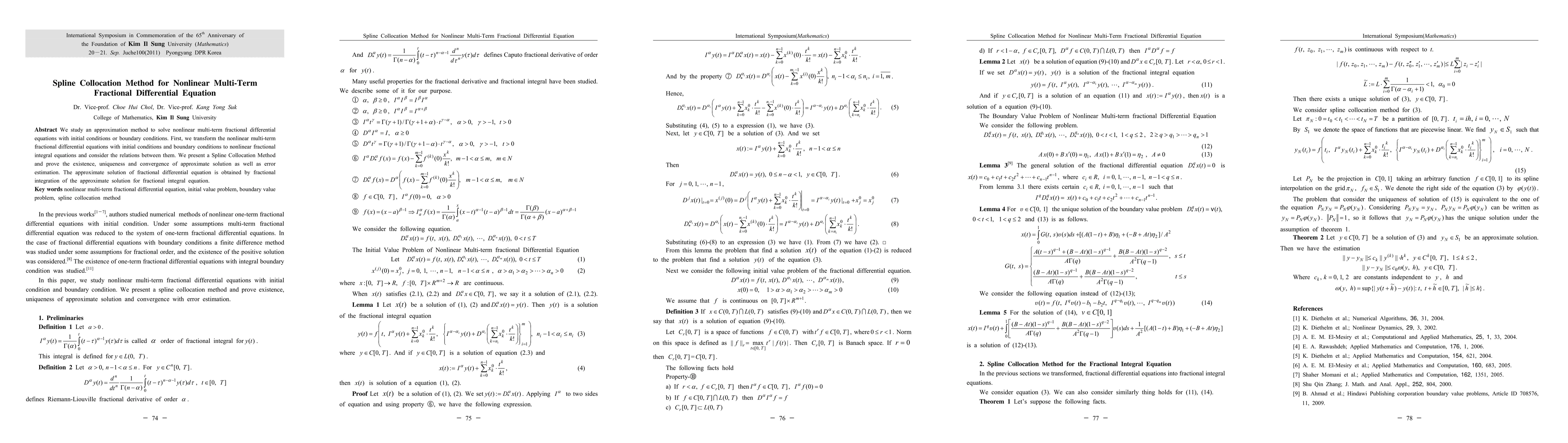 This paper proposes a Spline Collocation Method to solve nonlinear multi-term fractional differential equations, transforming them into fractional integral equations. It proves the existence, uniqueness, and convergence of the approximate solution, along with error estimation.