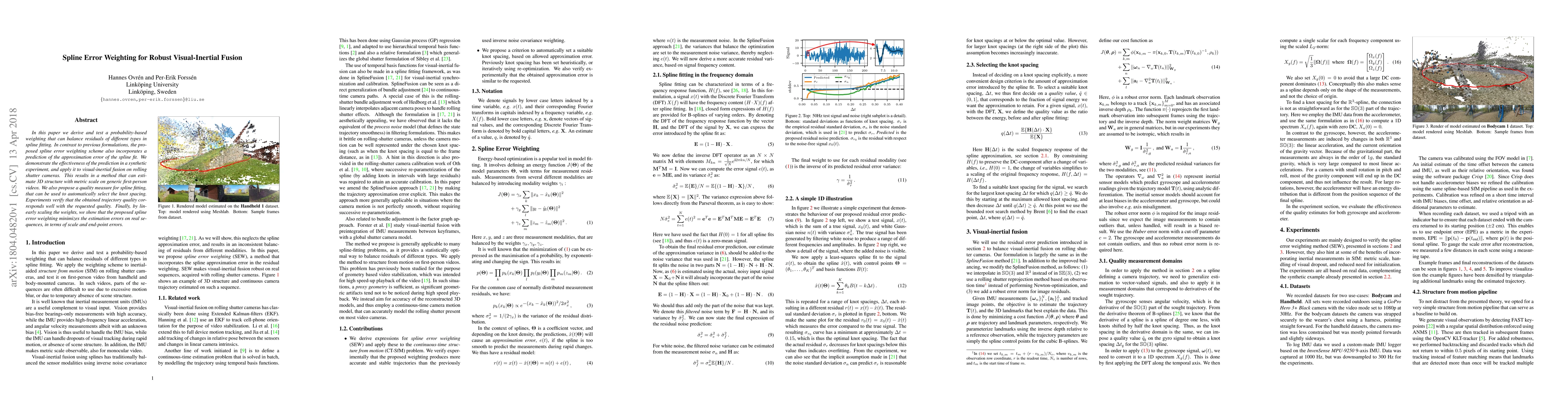 This paper proposes a new method for visual-inertial fusion that uses spline error weighting to improve accuracy, and demonstrates its effectiveness in estimating 3D structure with metric scale on generic first-person videos.