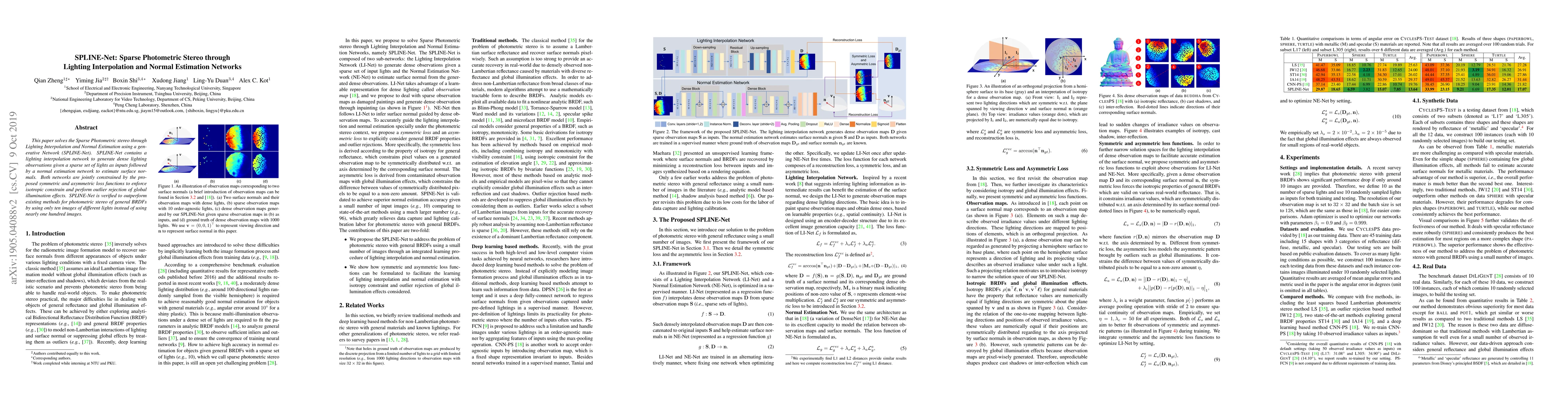 This paper solves the Sparse Photometric stereo through Lighting Interpolation and Normal Estimation using a generative Network (SPLINE-Net). SPLINE-Net contains a lighting interpolation network to generate dense lighting observations given a sparse set of lights as inputs followed by a normal estimation network to estimate surface normals. Both networks are jointly constrained by the proposed symmetric and asymmetric loss functions to enforce isotropic constrain and perform outlier rejection of global illumination effects. SPLINE-Net is verified to outperform existing methods for photometric stereo of general BRDFs by using only ten images of different lights instead of using nearly one hundred images.